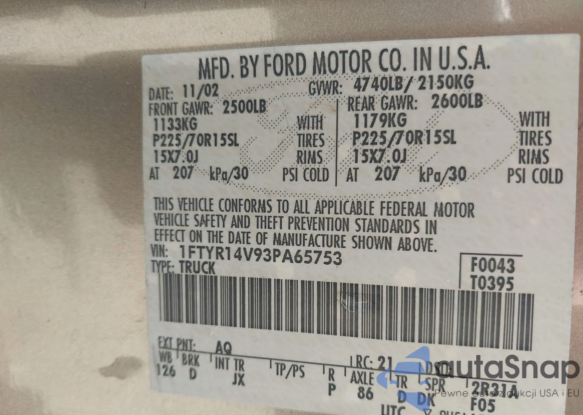 LOT: 43328517 VIN: 1FTYR14V93PA65753