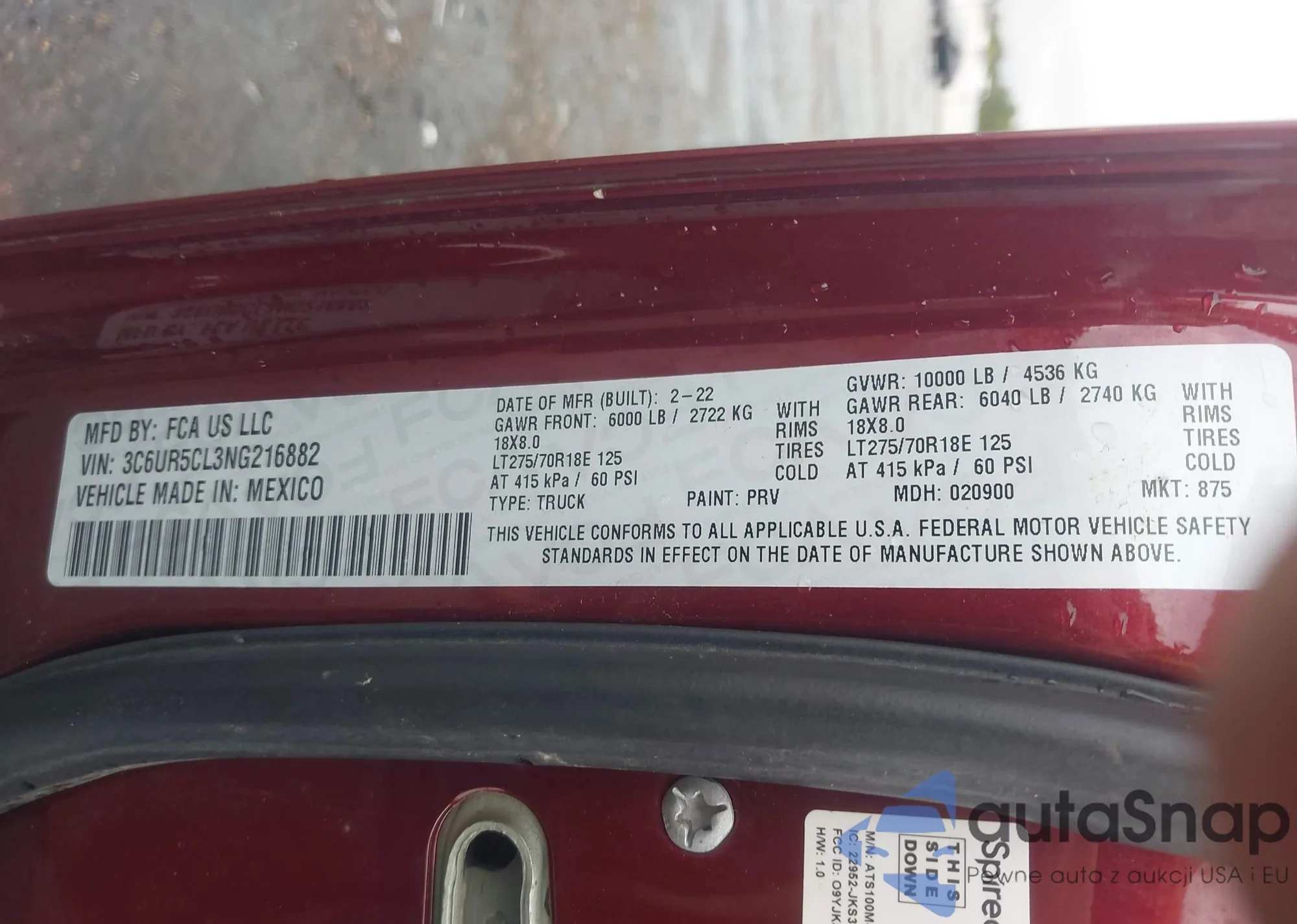 • VIN 3C6UR5CL3NG216882