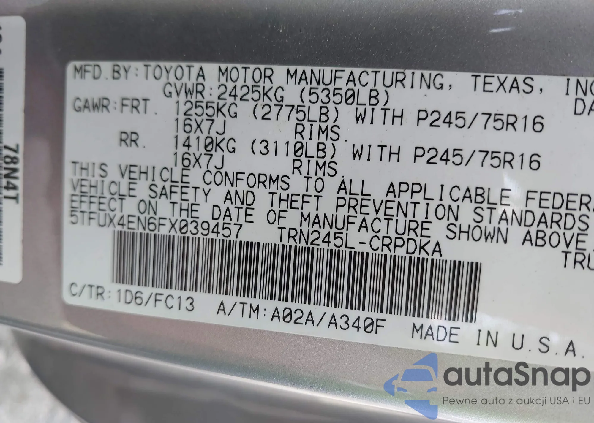 LOT: 43330553 VIN: 5TFUX4EN6FX039457