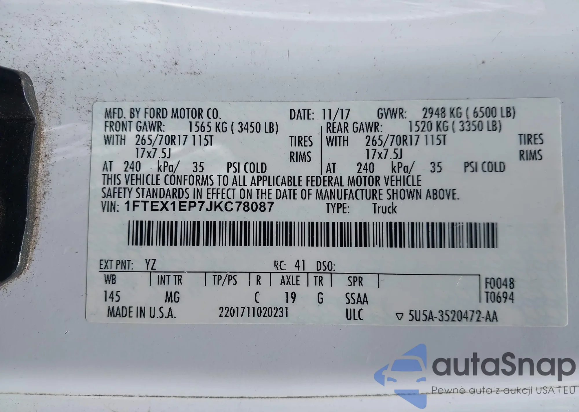 LOT: 42951703 VIN: 1FTEX1EP7JKC78087