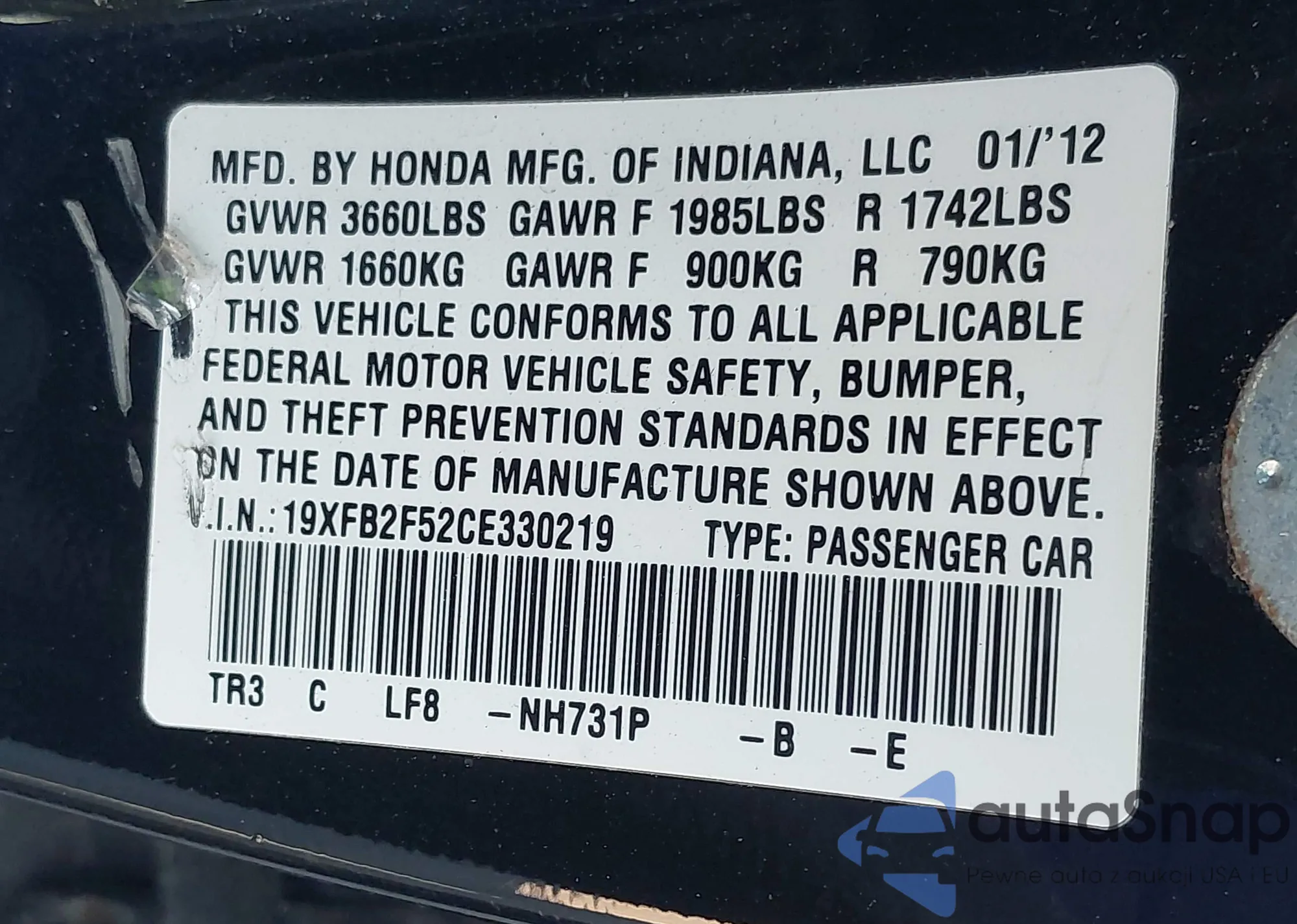 LOT: 43322191 VIN: 19XFB2F52CE330219