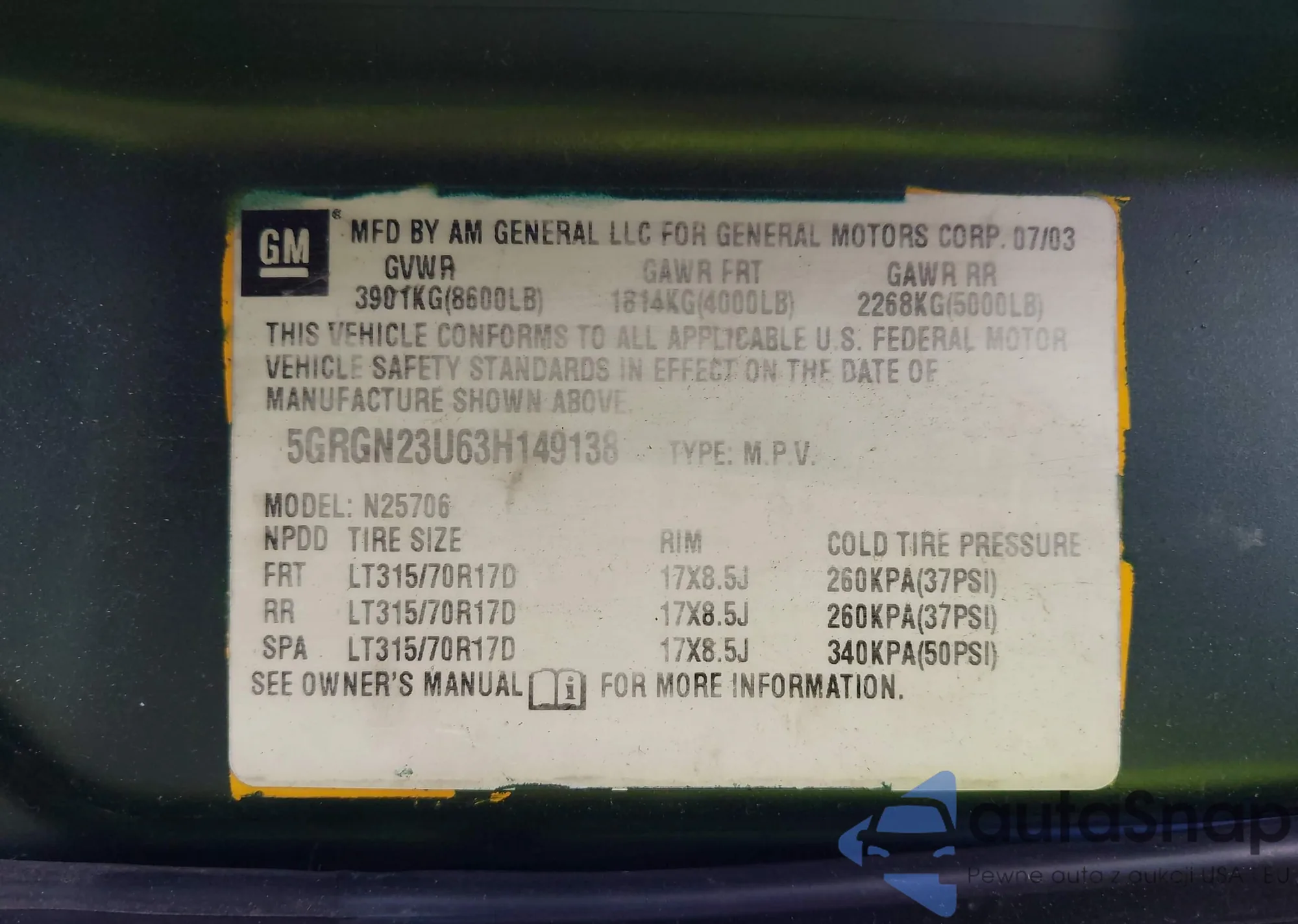 • VIN 5GRGN23U63H149138