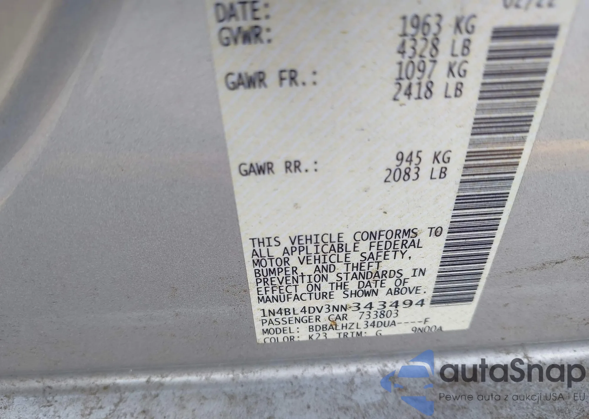 LOT: 43254713 VIN: 5N1BT3BA9PC845103