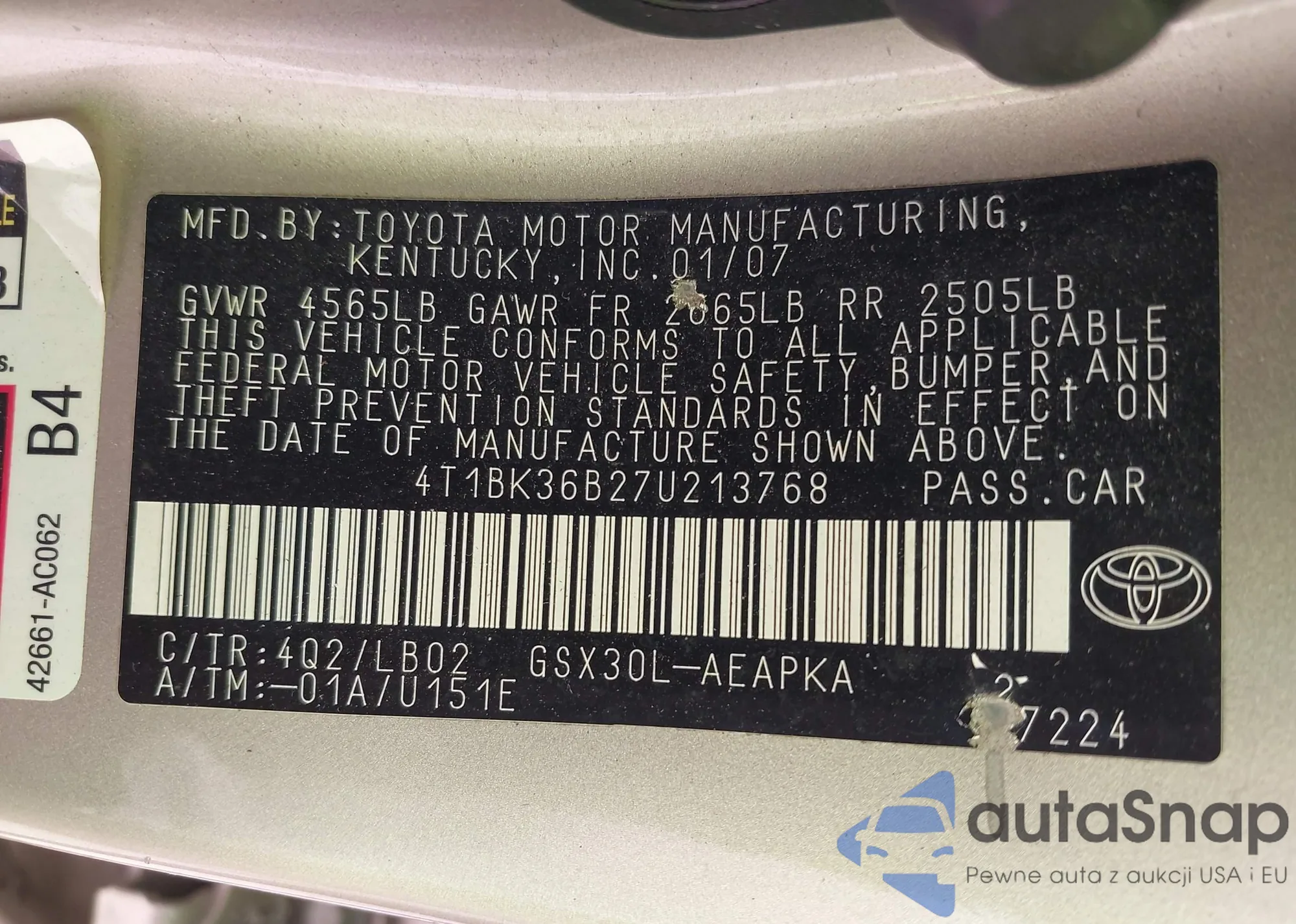 LOT: 43271330 VIN: 4T1BK36B47U180336