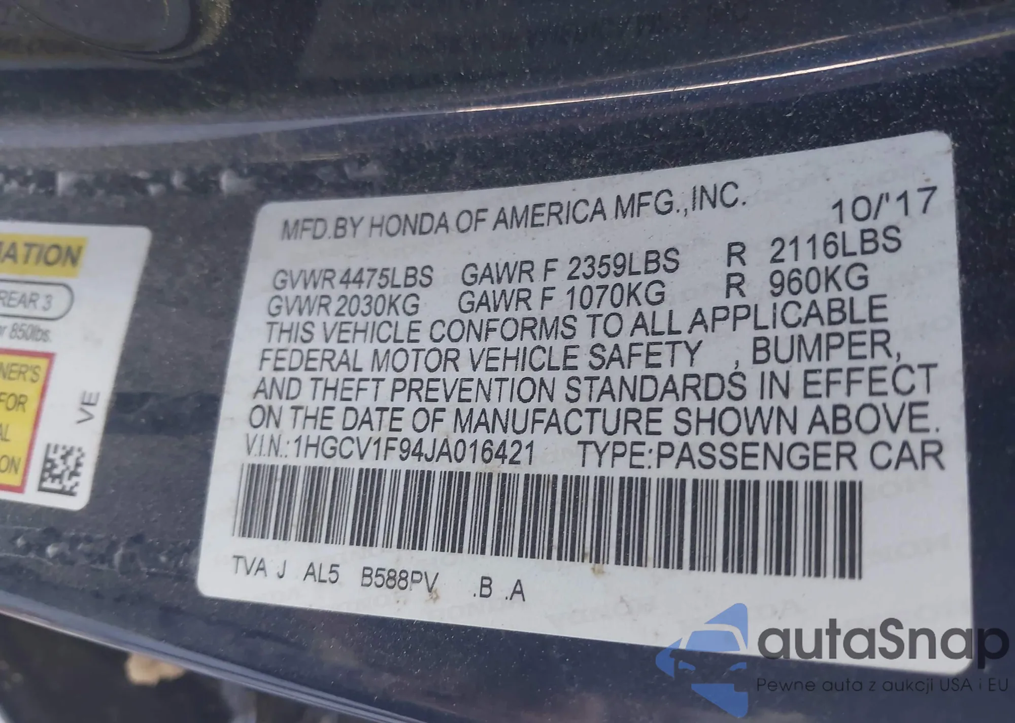 LOT: 43118879 VIN: 1HGCV1F94JA016421