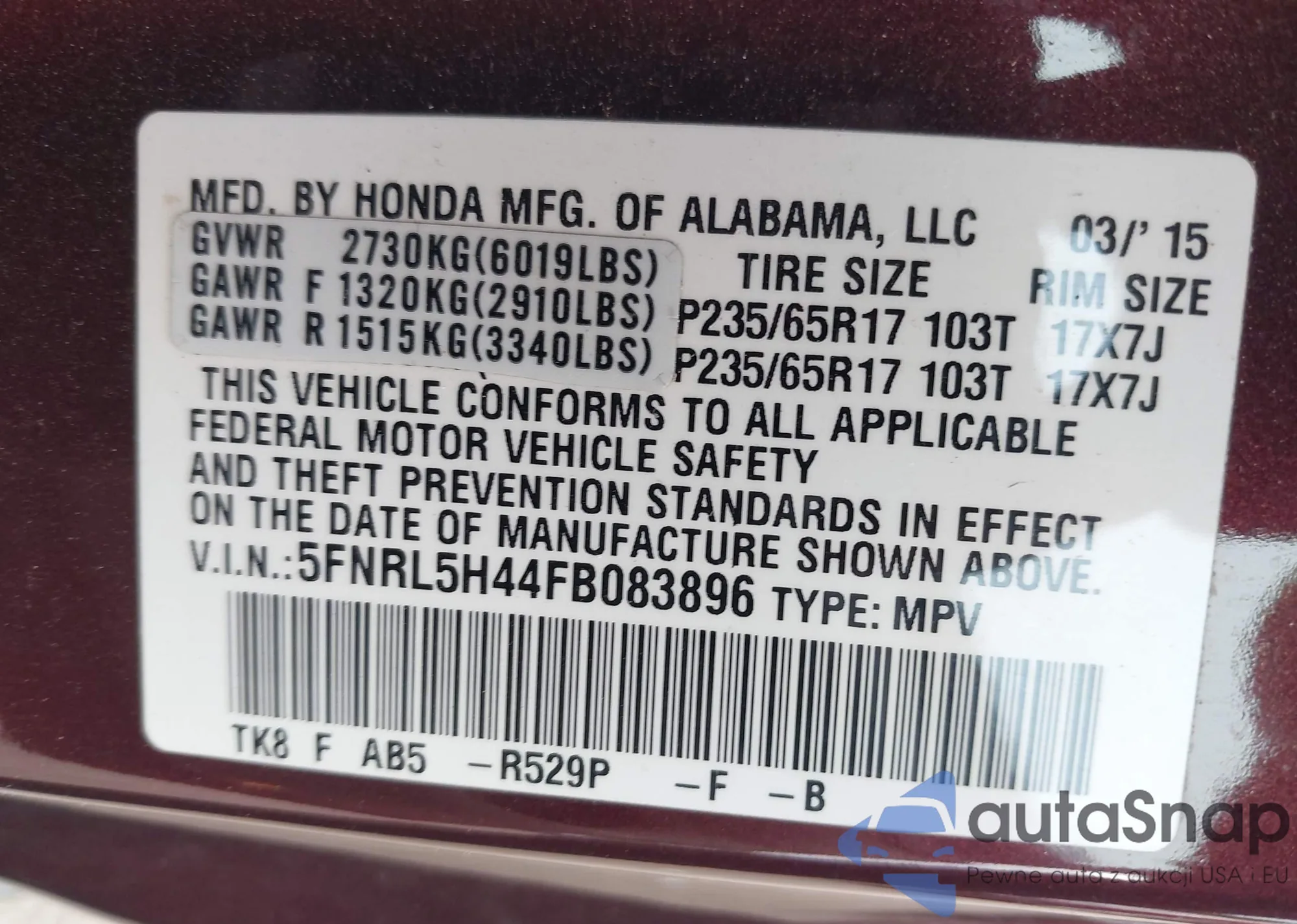 • VIN 5FNYF5H57KB031474
