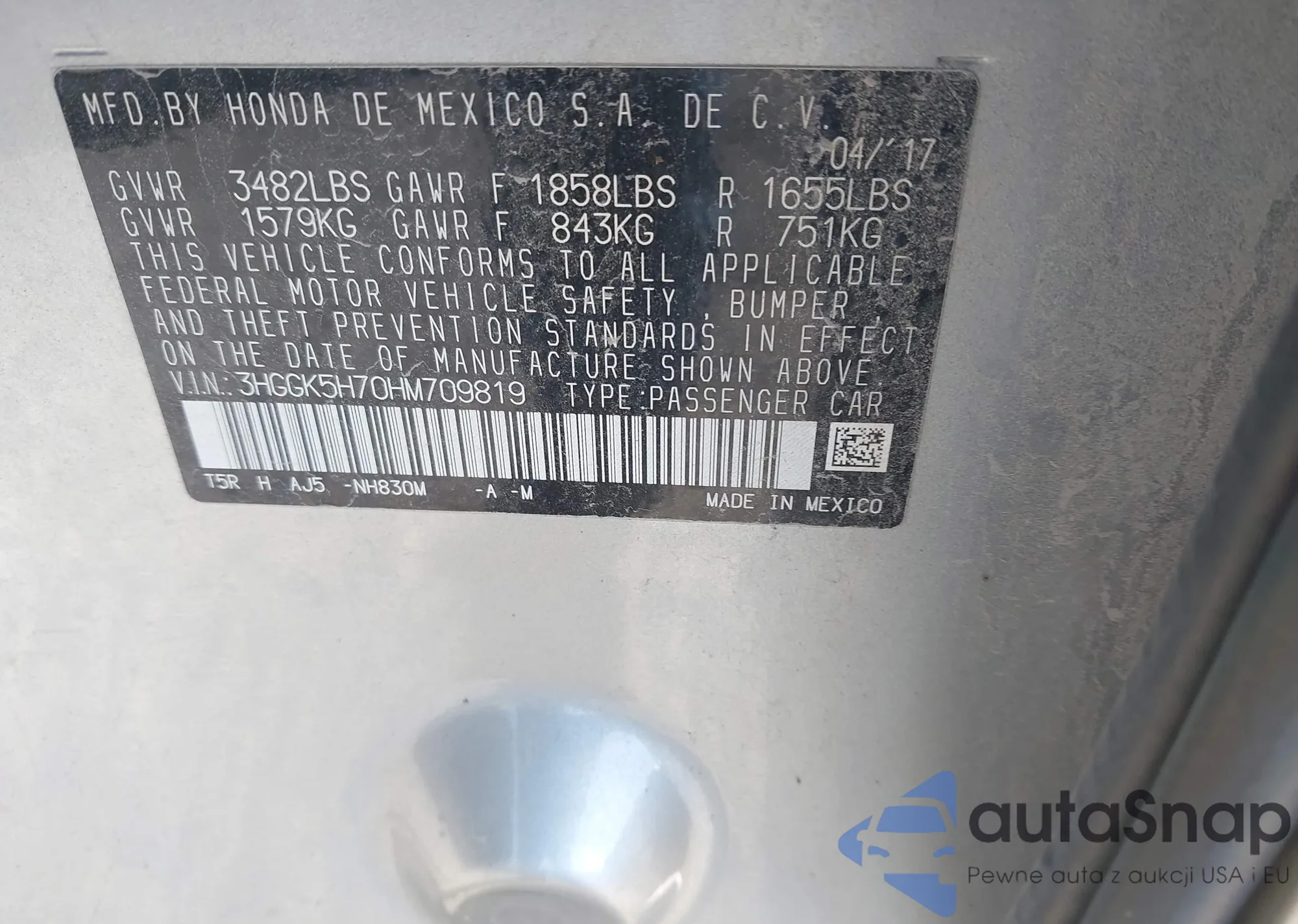 LOT: 43355913 VIN: 3HGGK5H70HM709819