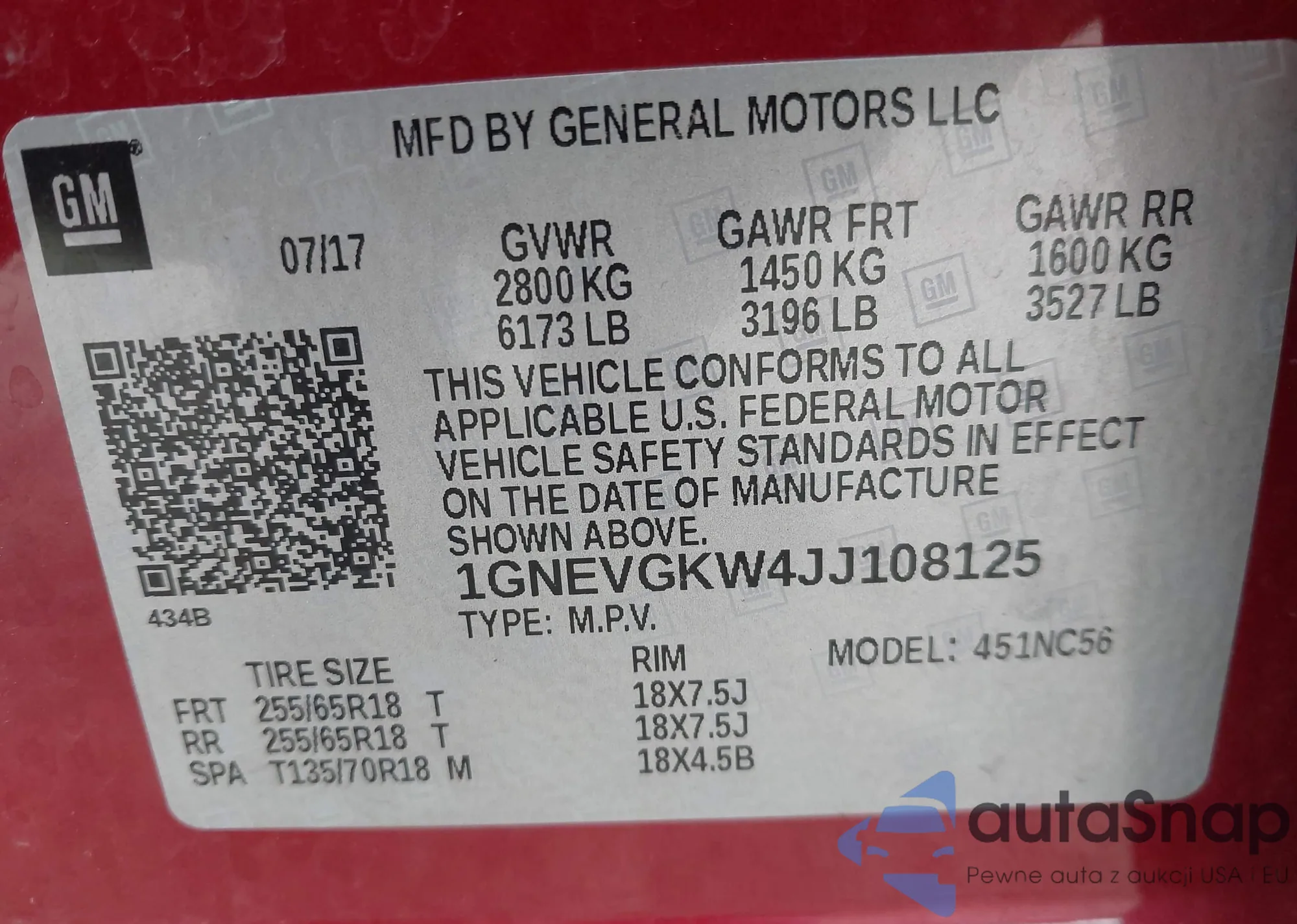 LOT: 43319010 VIN: 1GNEVGKW4JJ108125