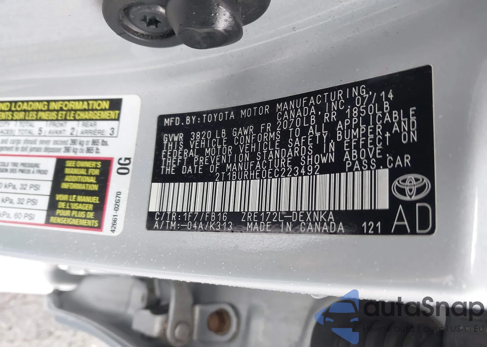 LOT: 43433338 VIN: 2T1BURHE0EC223492