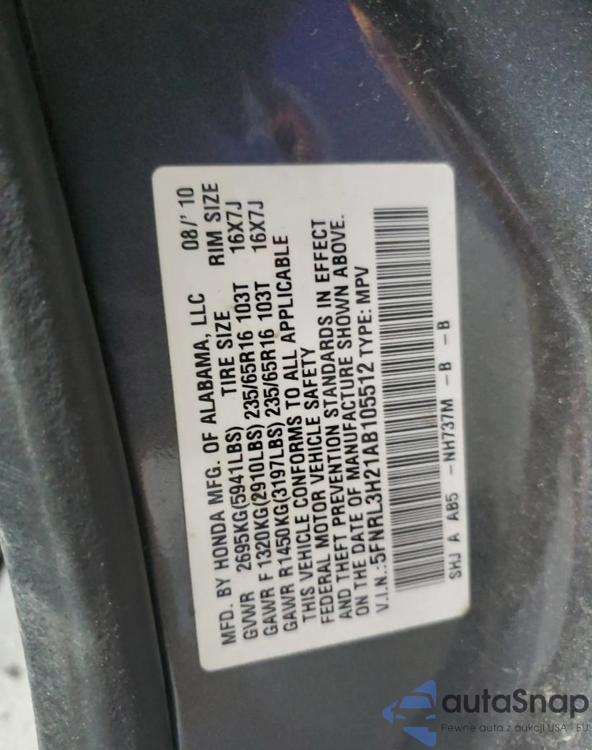 • VIN 5FNRL3H21AB105512