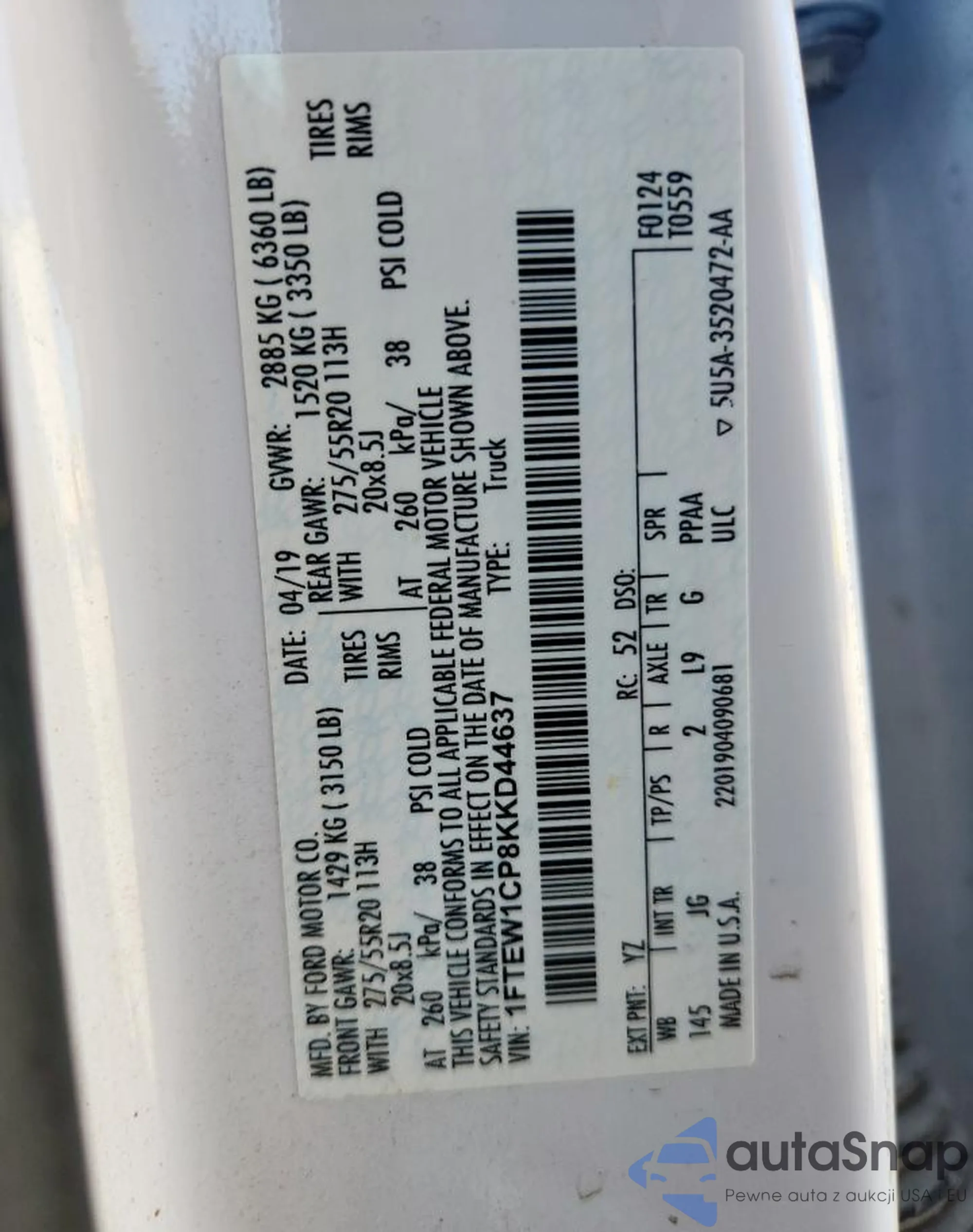 LOT: 70878125 VIN: 1FTEW1CP8KKD44637