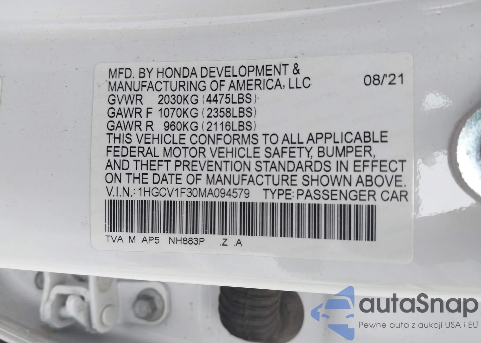 LOT: 42485054 VIN: 1HGCV1F30MA094579