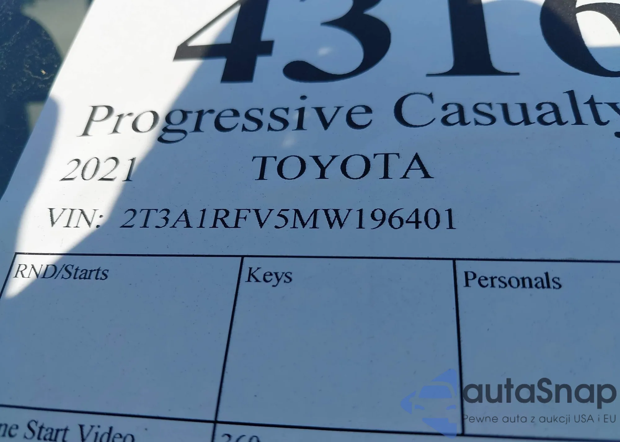 LOT: 43168389 VIN: 2T3A1RFV5MW196401