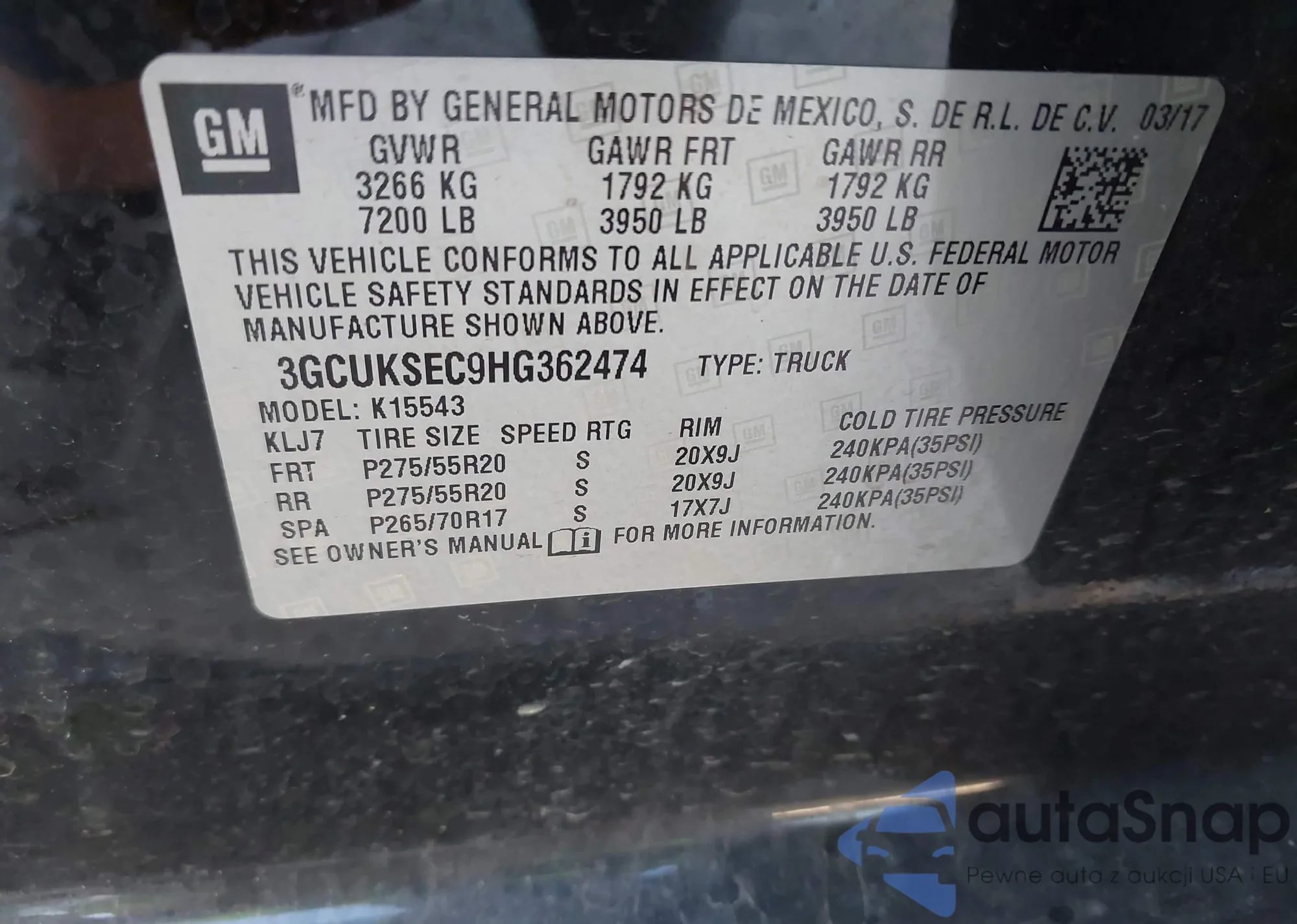 • VIN 3GCUKSEC9HG362474