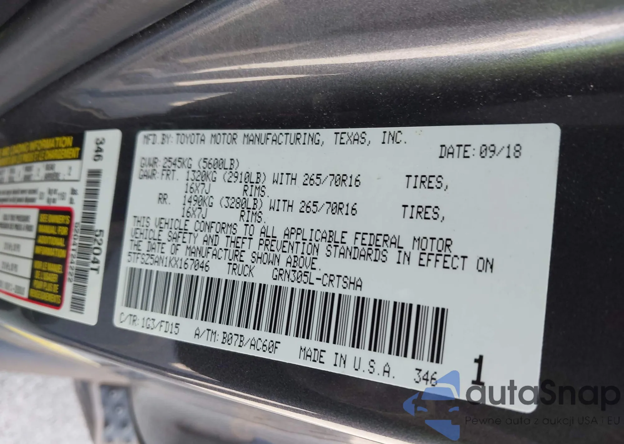 • VIN 5TFSZ5AN1KX167046