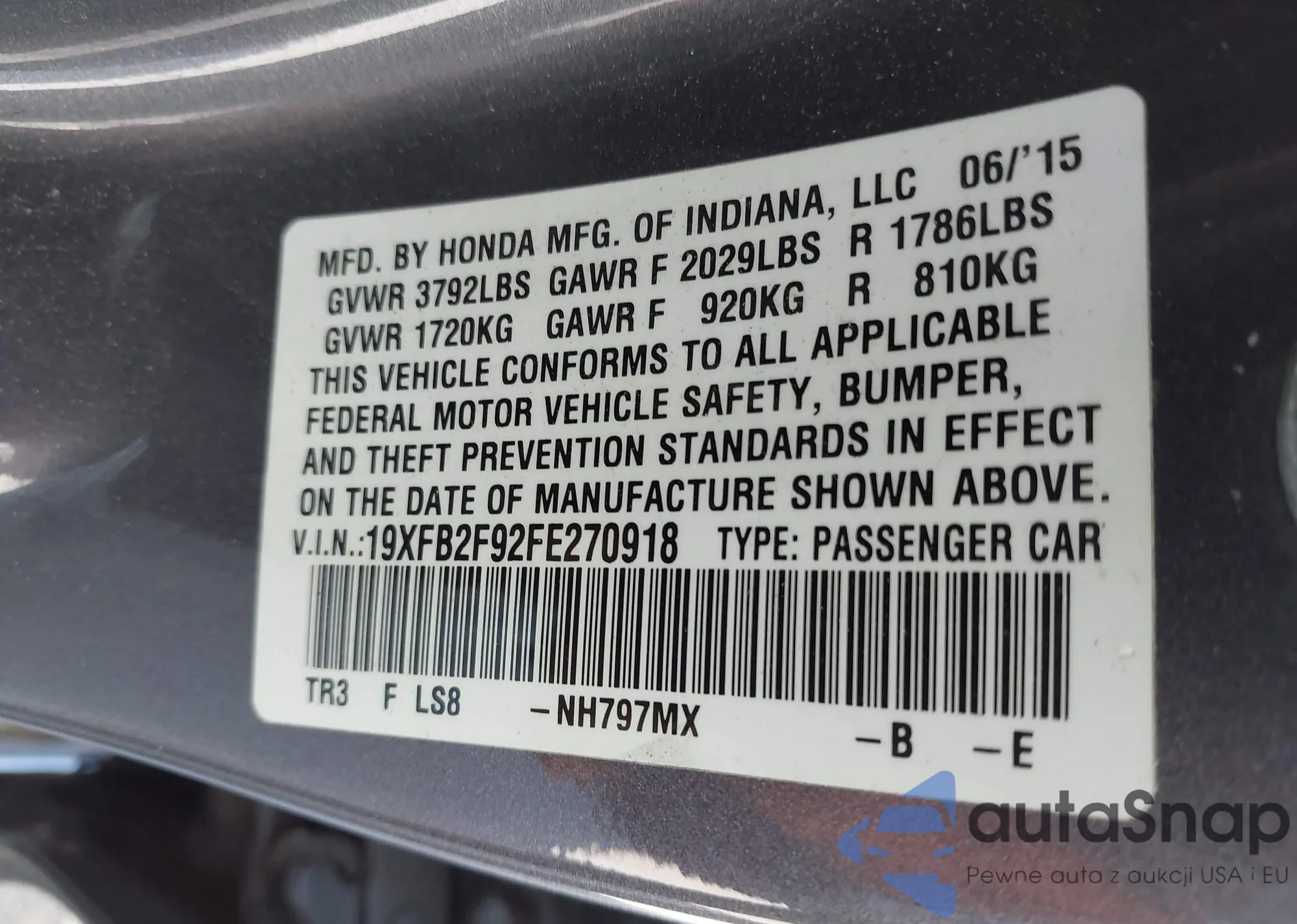 LOT: 43398598 VIN: 19XFB2F92FE270918