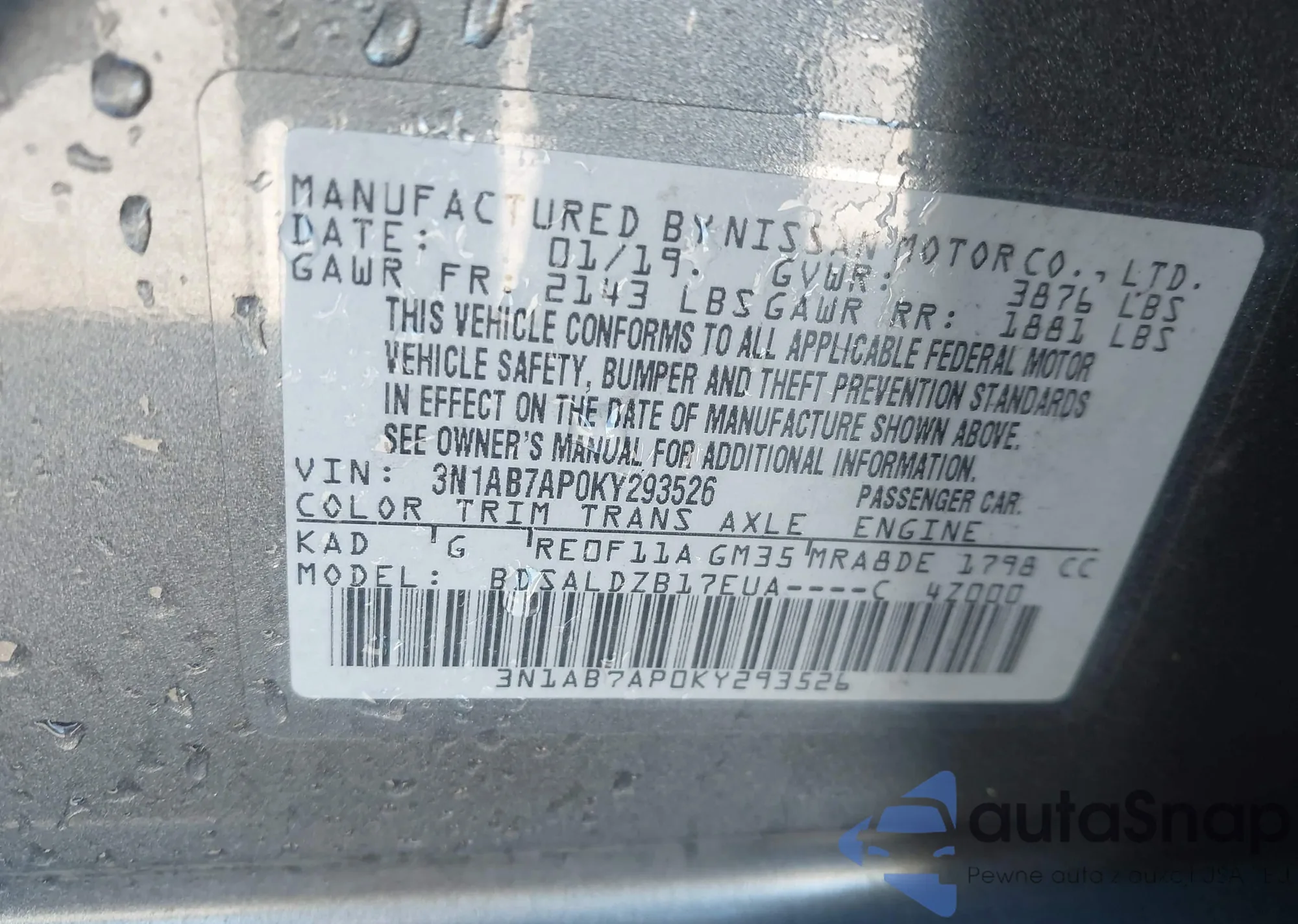 LOT: 43403034 VIN: 3N1AB7AP0KY293526