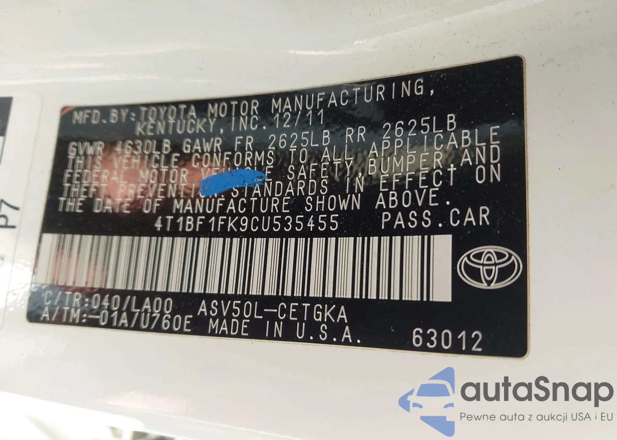 • VIN 4T1BF1FK9CU535455