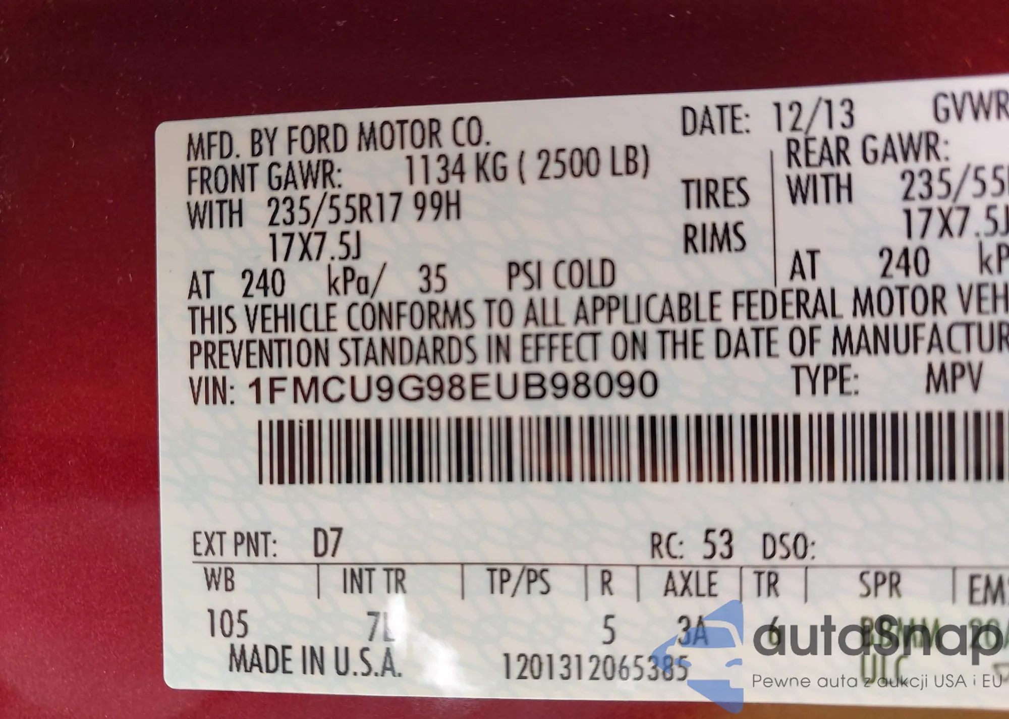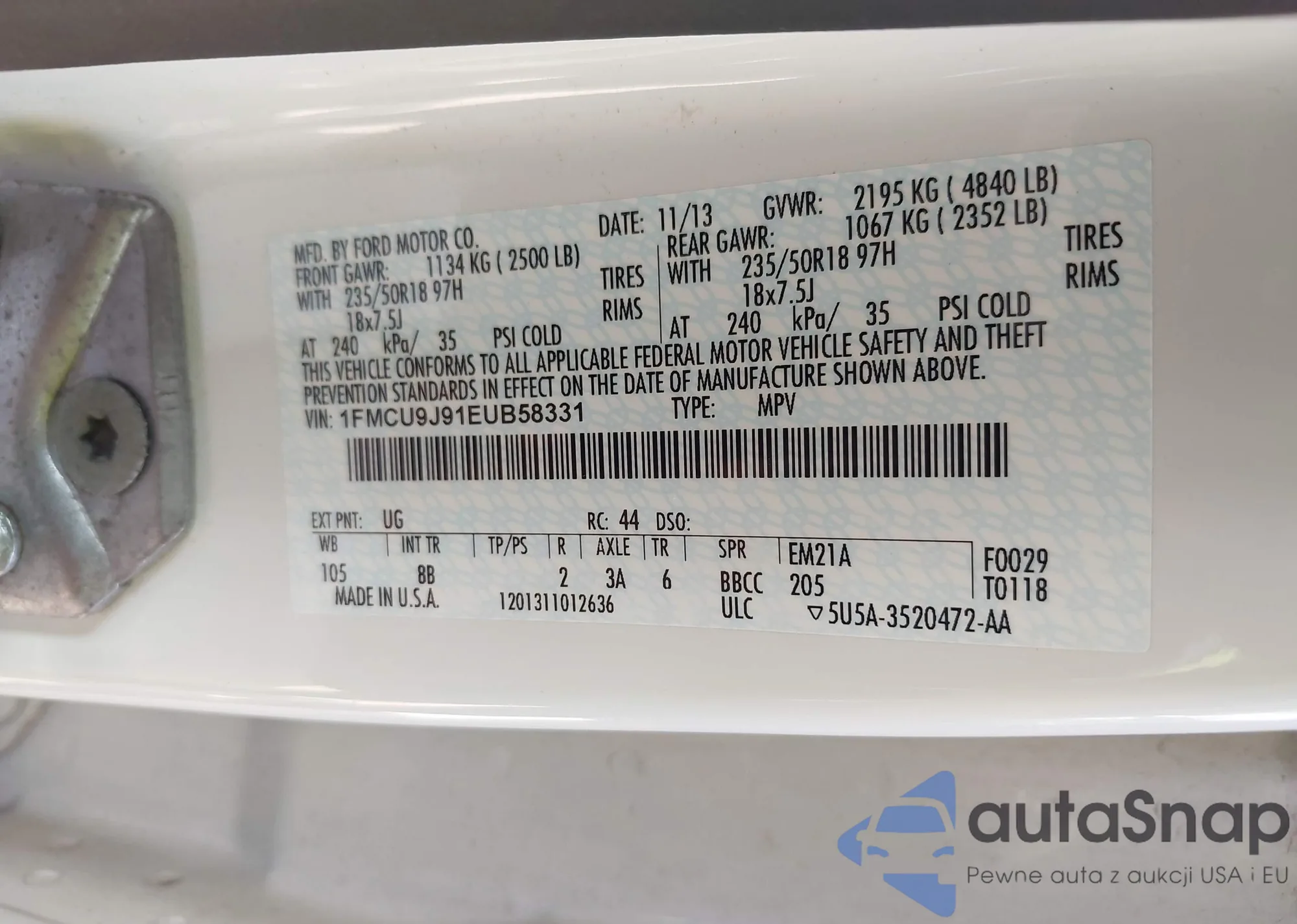 LOT: 43275440 VIN: 1FMCU9G98EUB98090