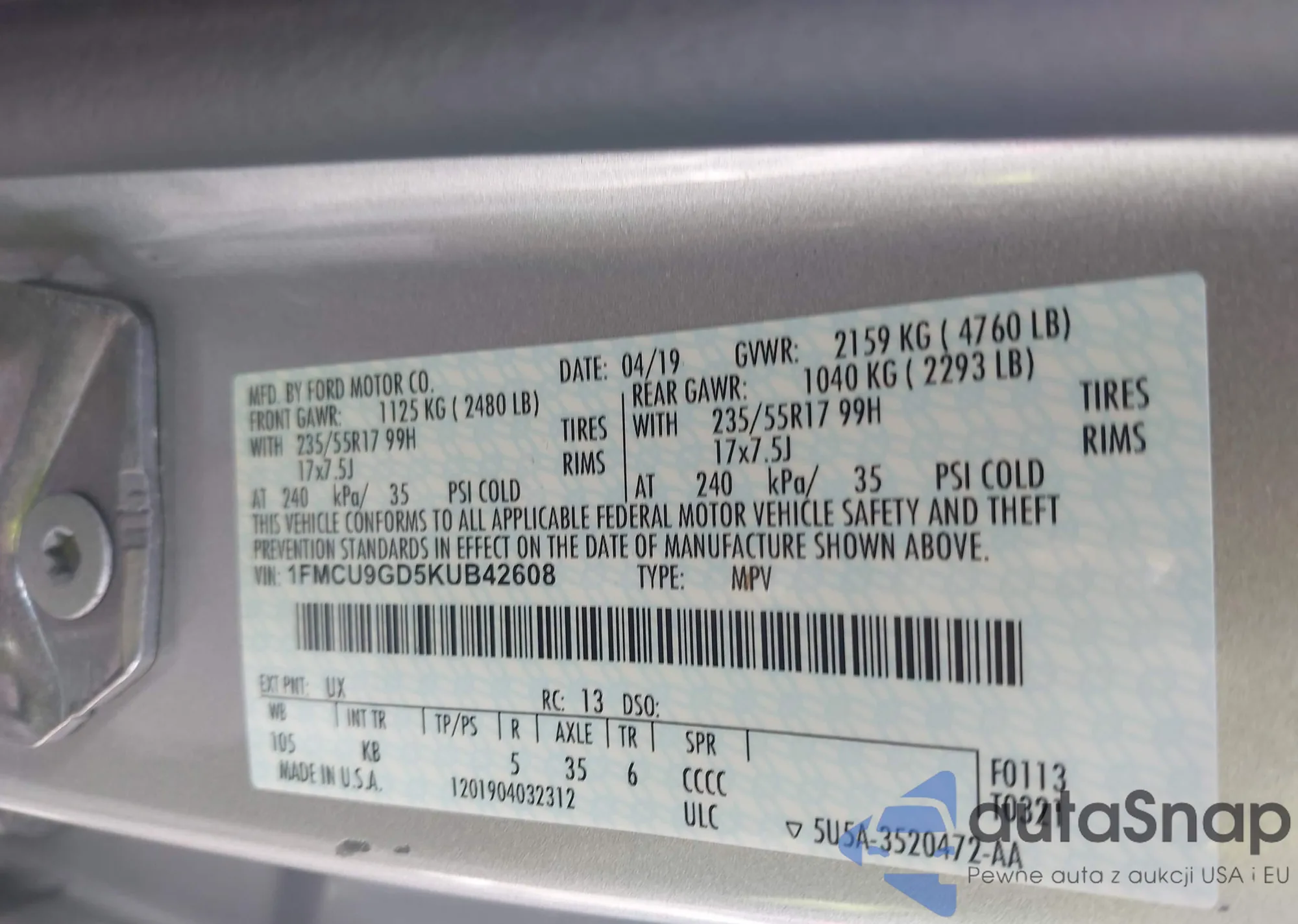 • VIN 1FMCU9GD5KUB42608
