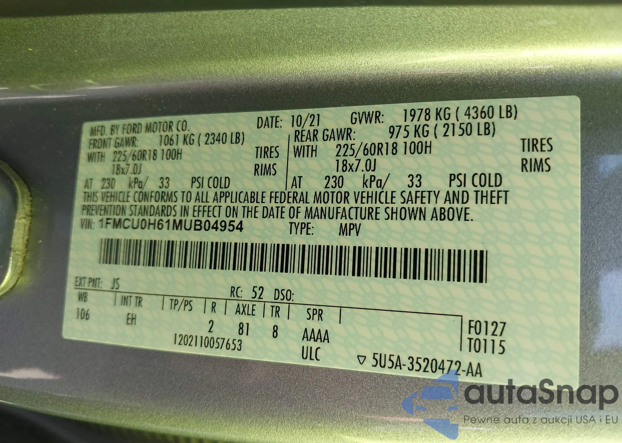 • VIN 1FMCU0H61MUB04954