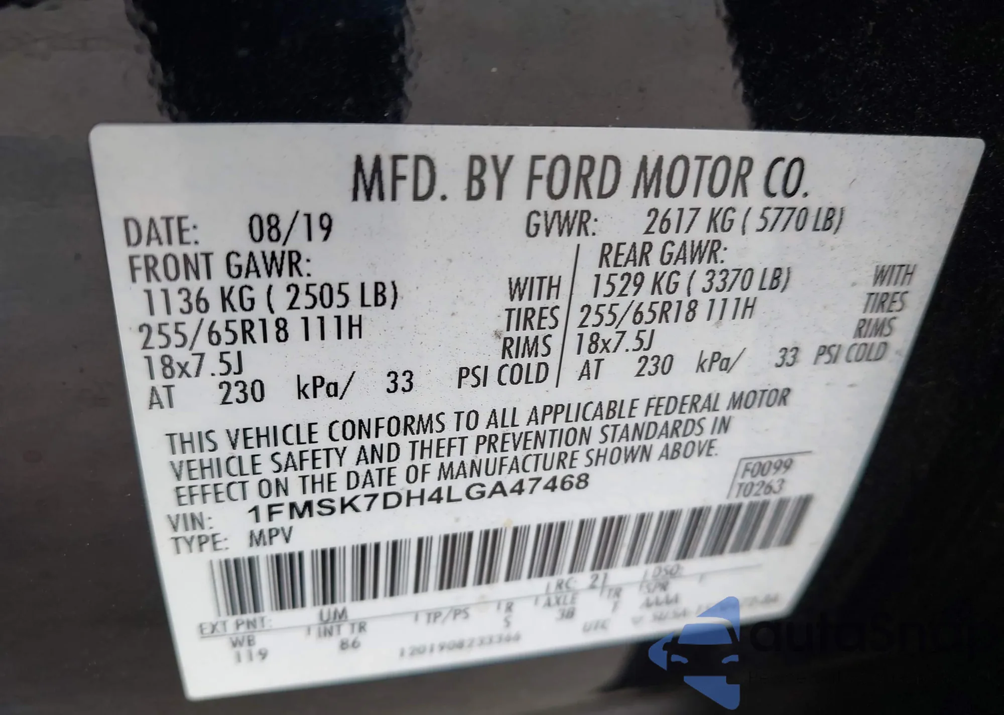 LOT: 43337770 VIN: 1FMSK7DH4LGA47468