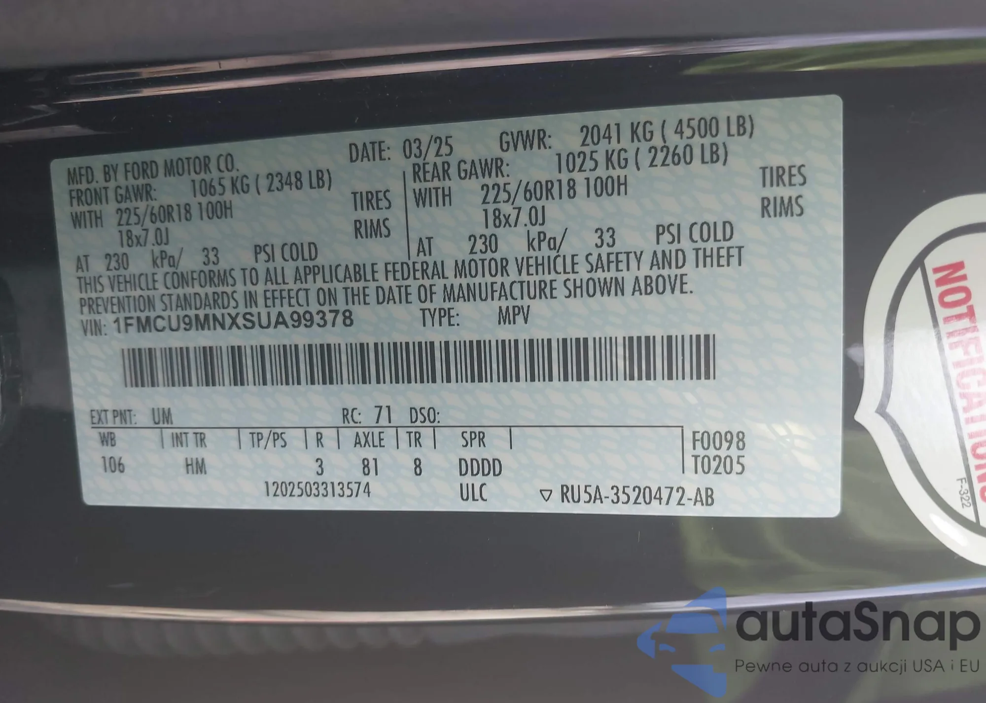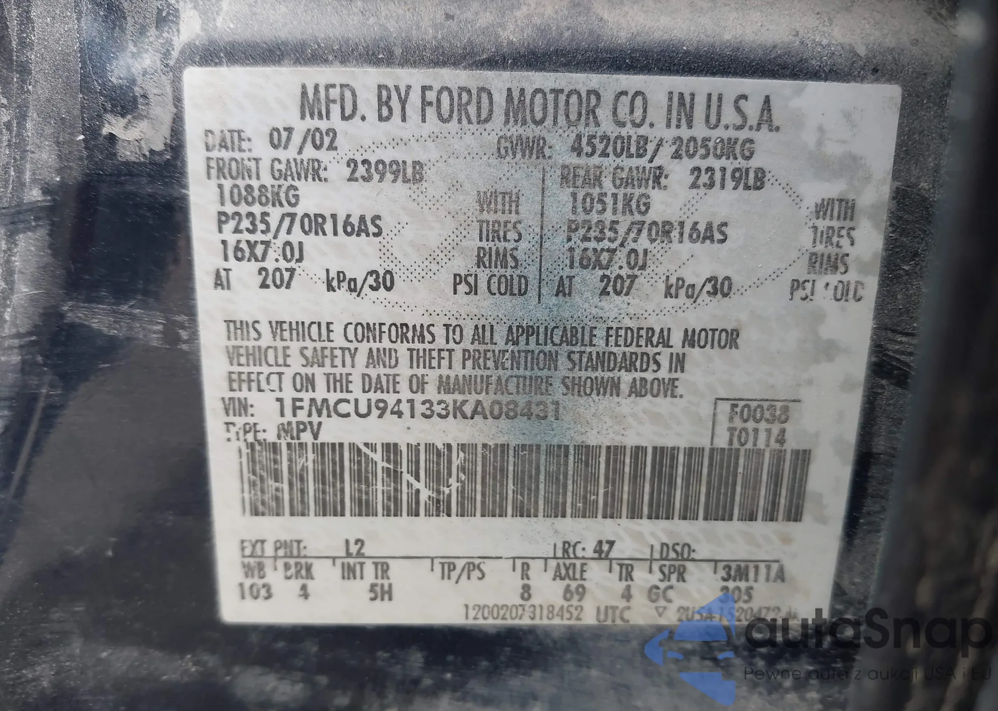 LOT: 43370048 VIN: 1FMCU94133KA08431