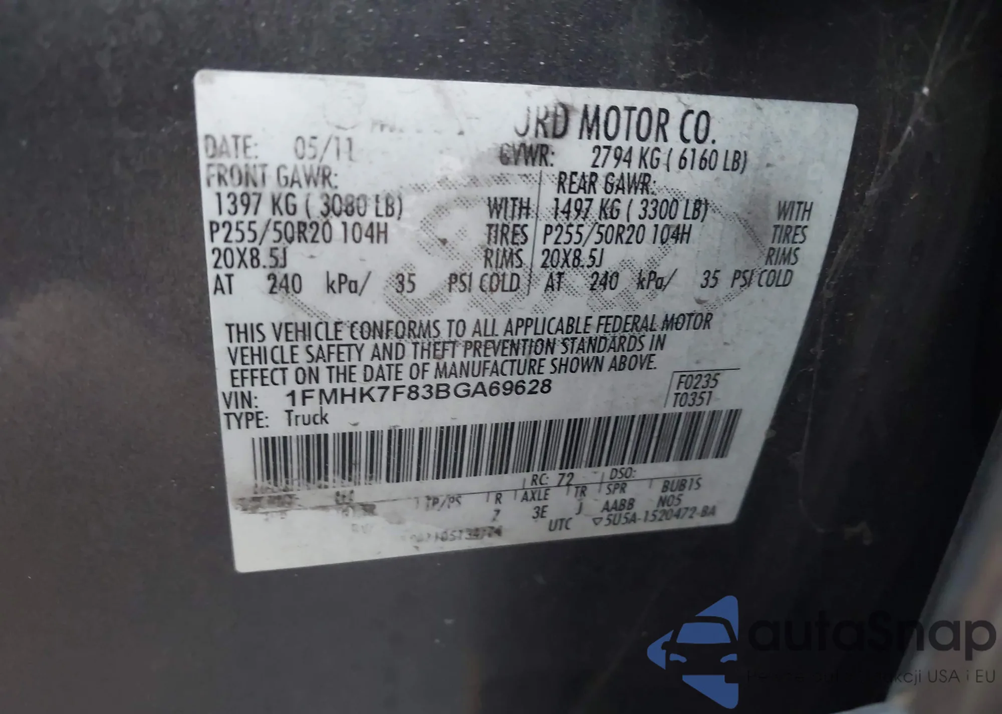 LOT: 43041622 VIN: 1FMHK8F86BGA87871