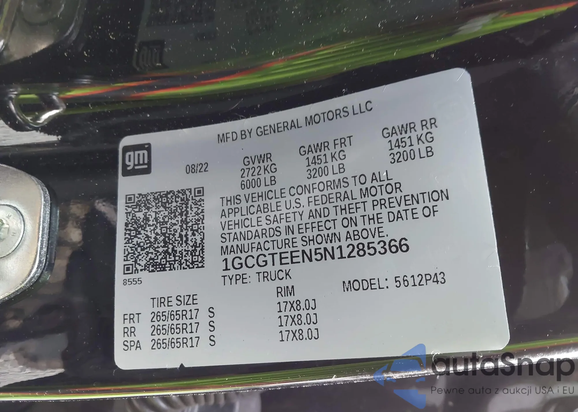 LOT: 43295487 VIN: 1GCGTEEN5N1285366