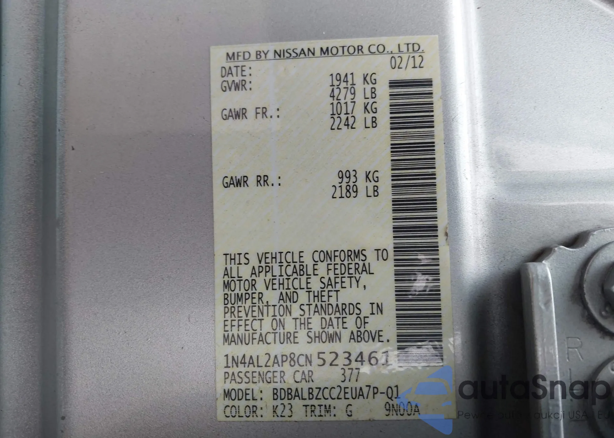 LOT: 43276394 VIN: 1N4AL2AP8CN523461