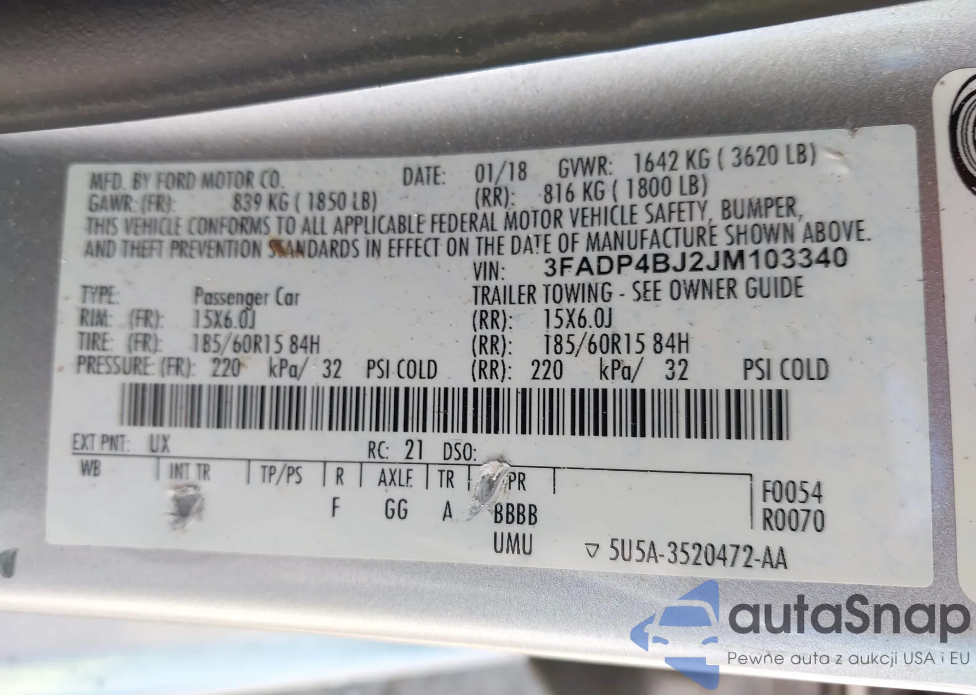 LOT: 43120570 VIN: 3FA6P0HD1JR203046