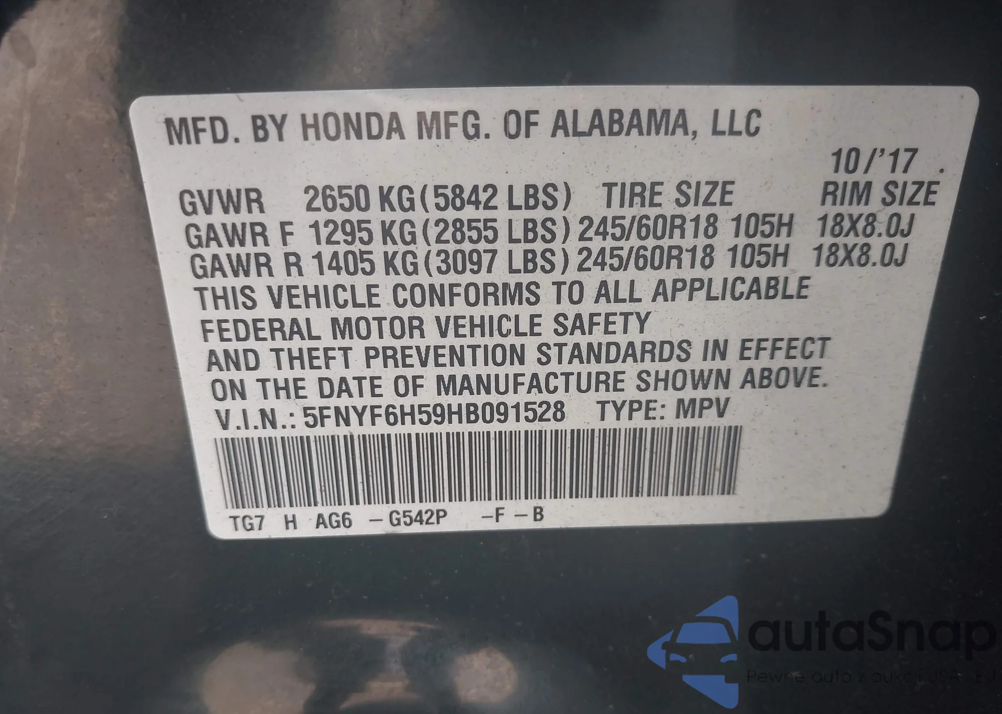 LOT: 42938724 VIN: 5FNYF6H59HB091528