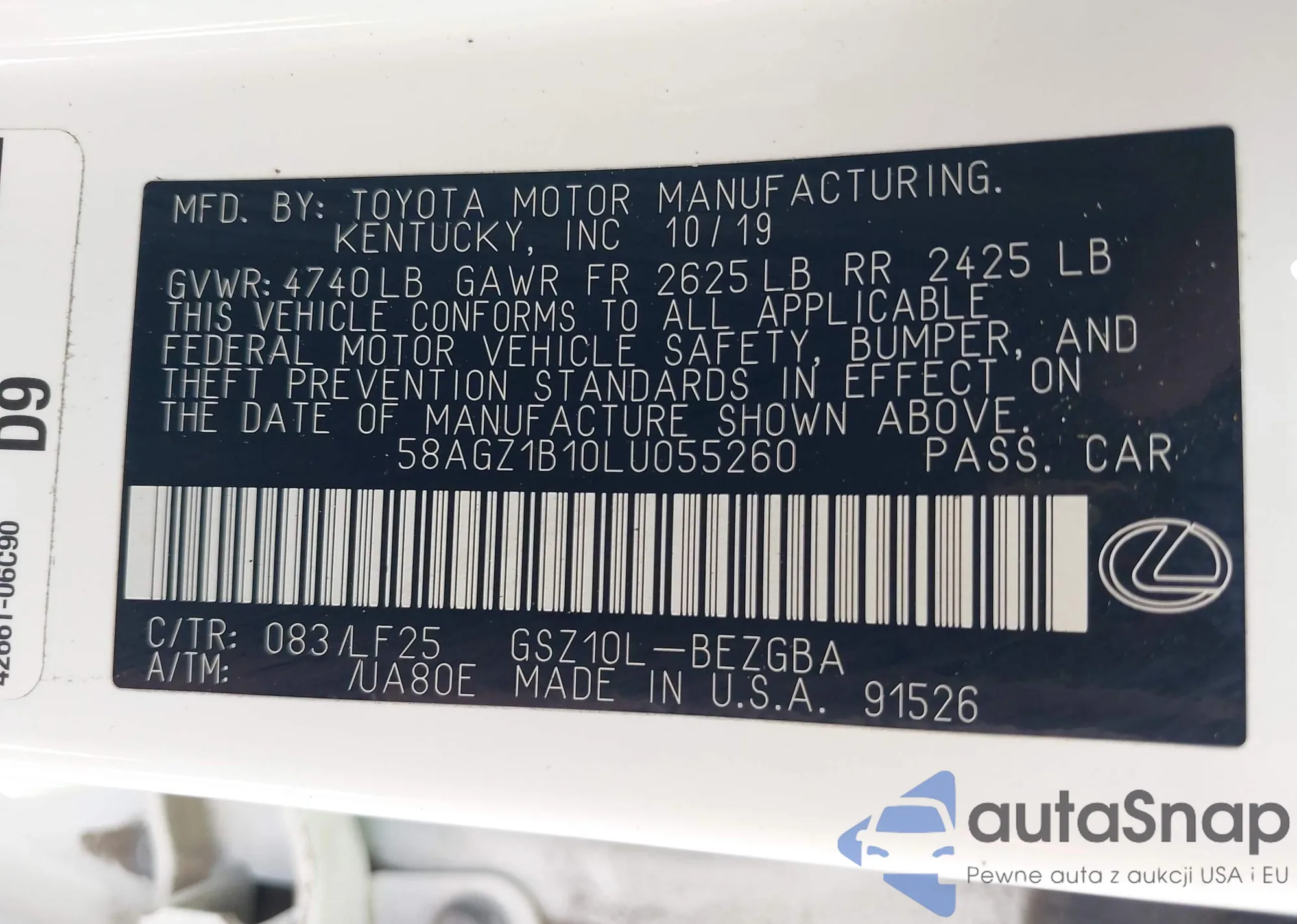LOT: 43081790 VIN: 4T1K61AK5LU345563