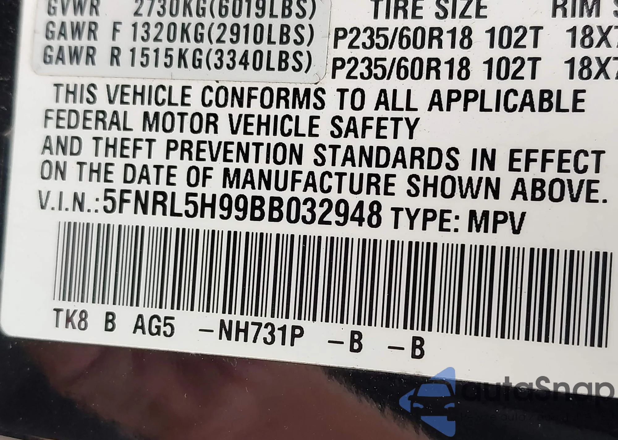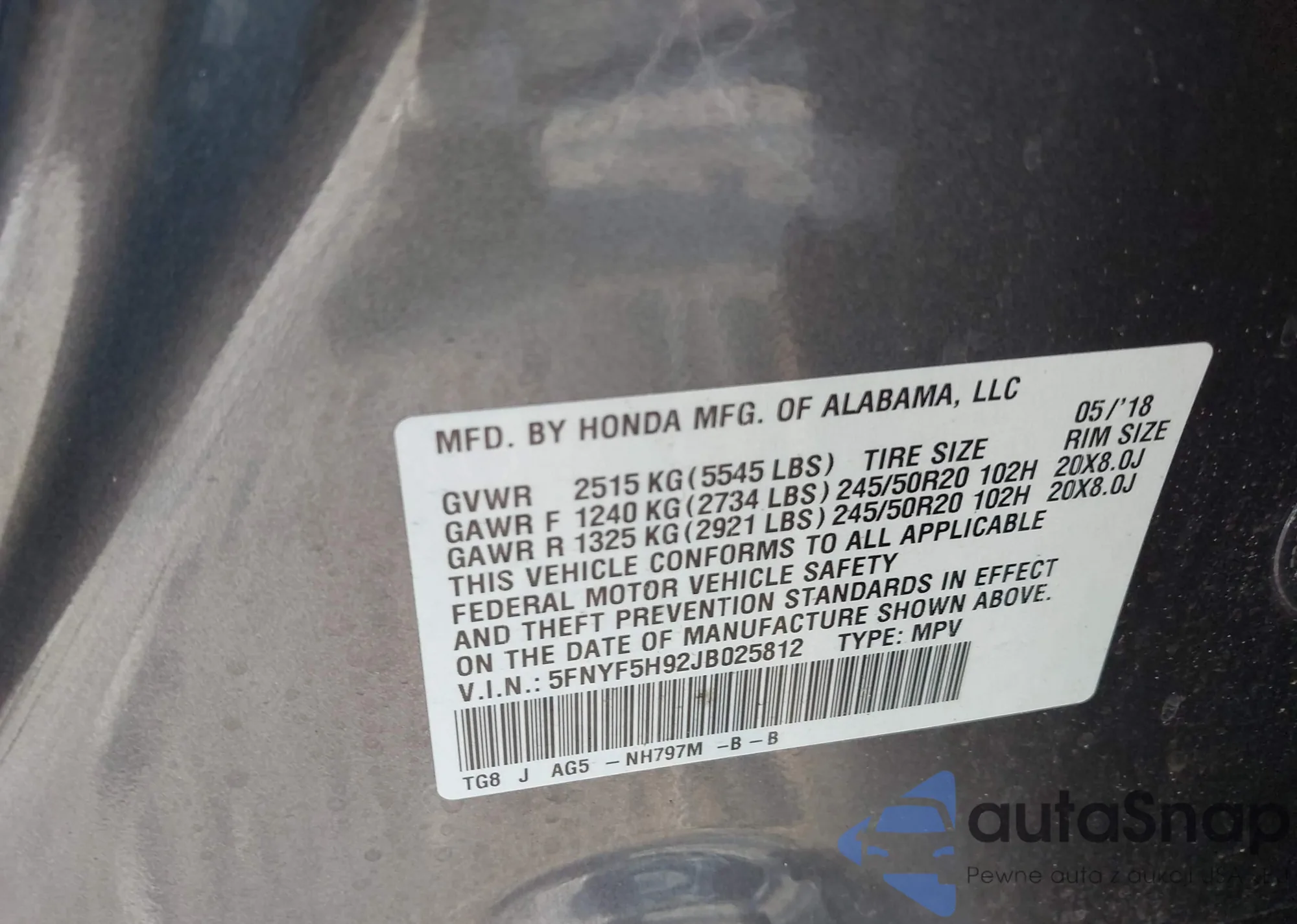 • VIN 5FNYF5H92JB025812