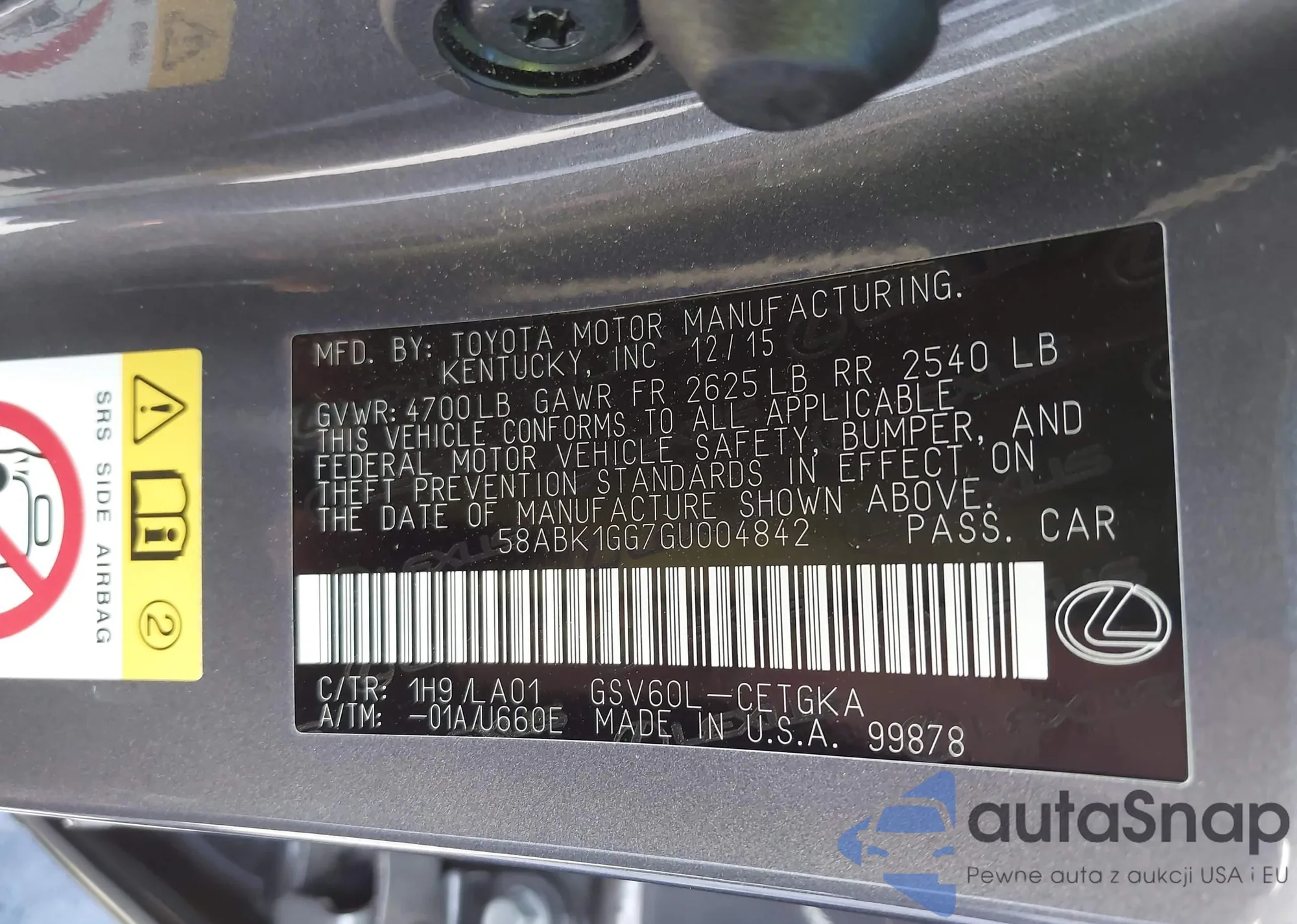 2016 Lexus Es 350 from USA, damaged, VIN 58ABK1GG7GU004842