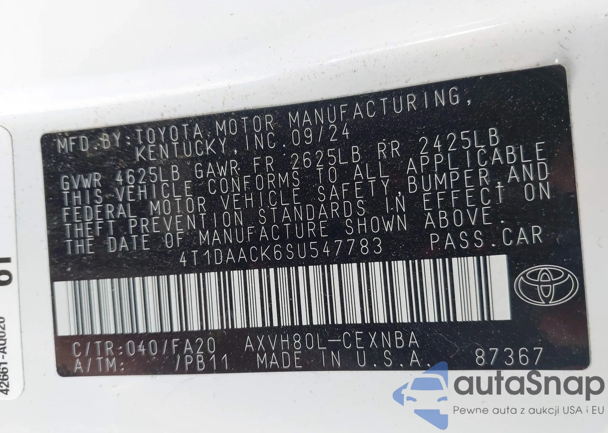 LOT: 43476029 VIN: 4T1DAACK6SU547783