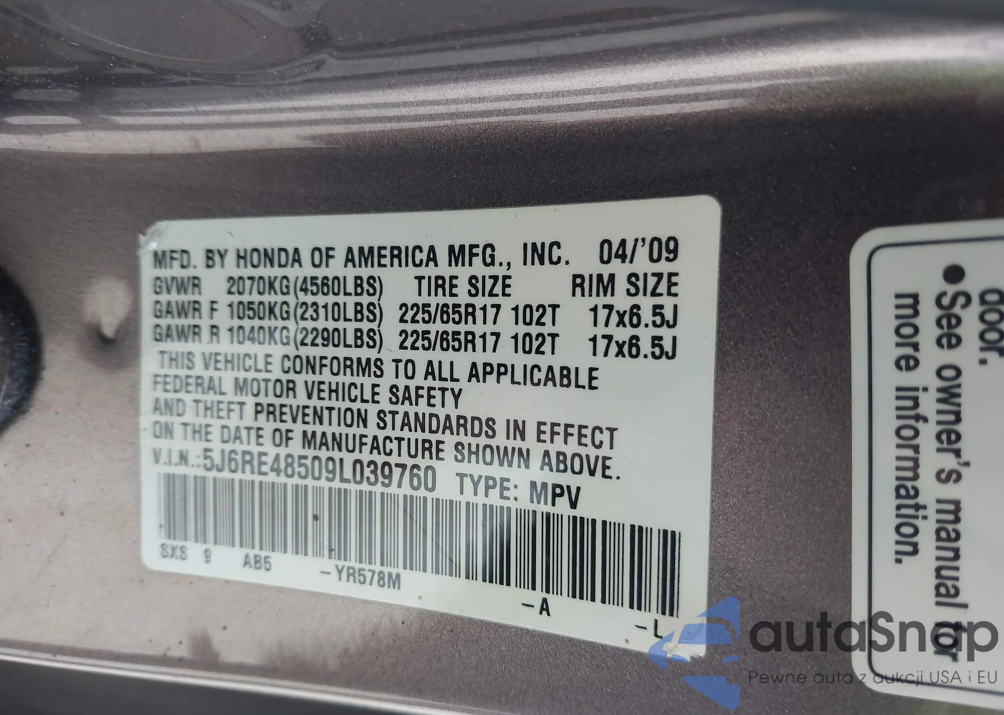 • VIN 5J6RE48509L039760
