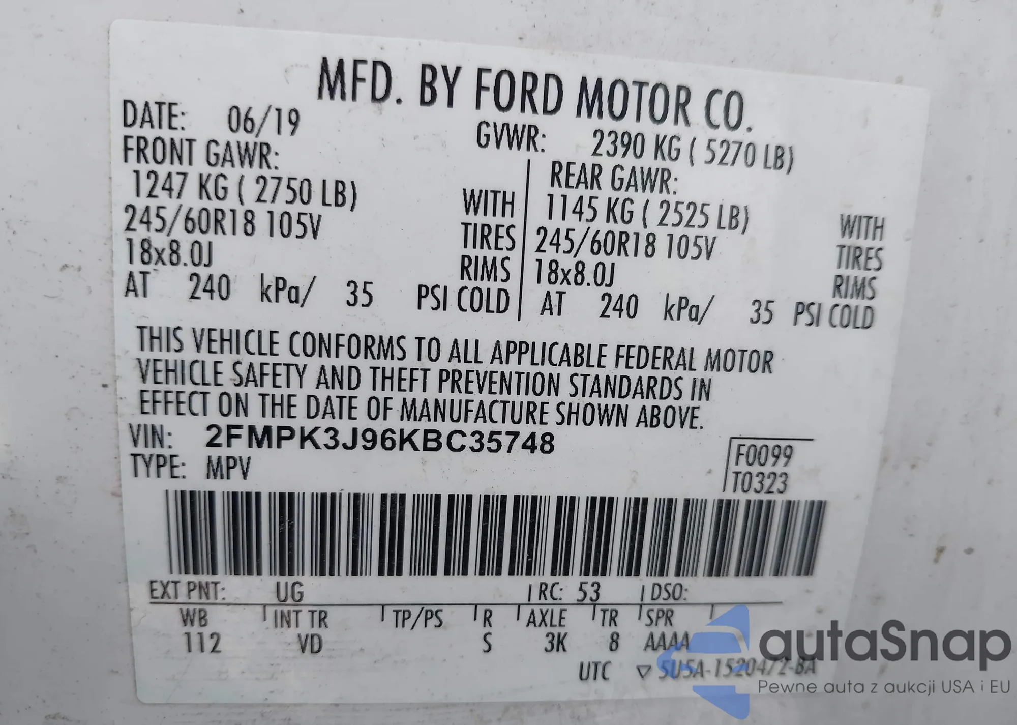 LOT: 43164243 VIN: 1FA6P8TH0F5412118