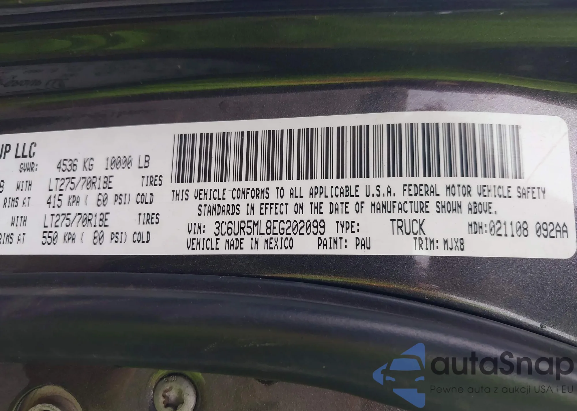 • VIN 3C6UR5ML8EG202099