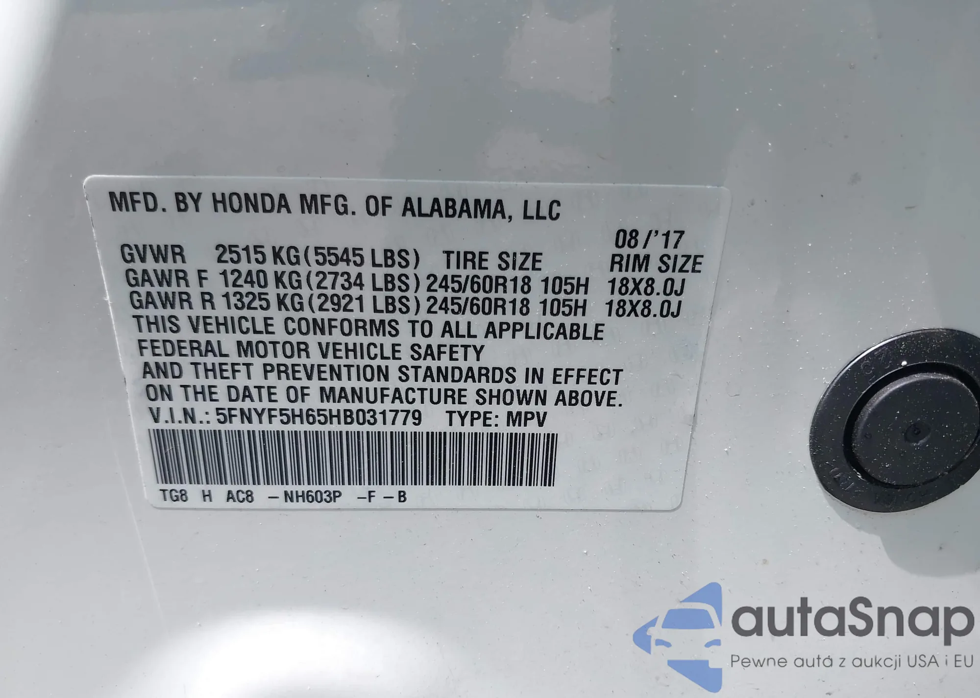 LOT: 43196473 VIN: 5FNYF5H65HB031779
