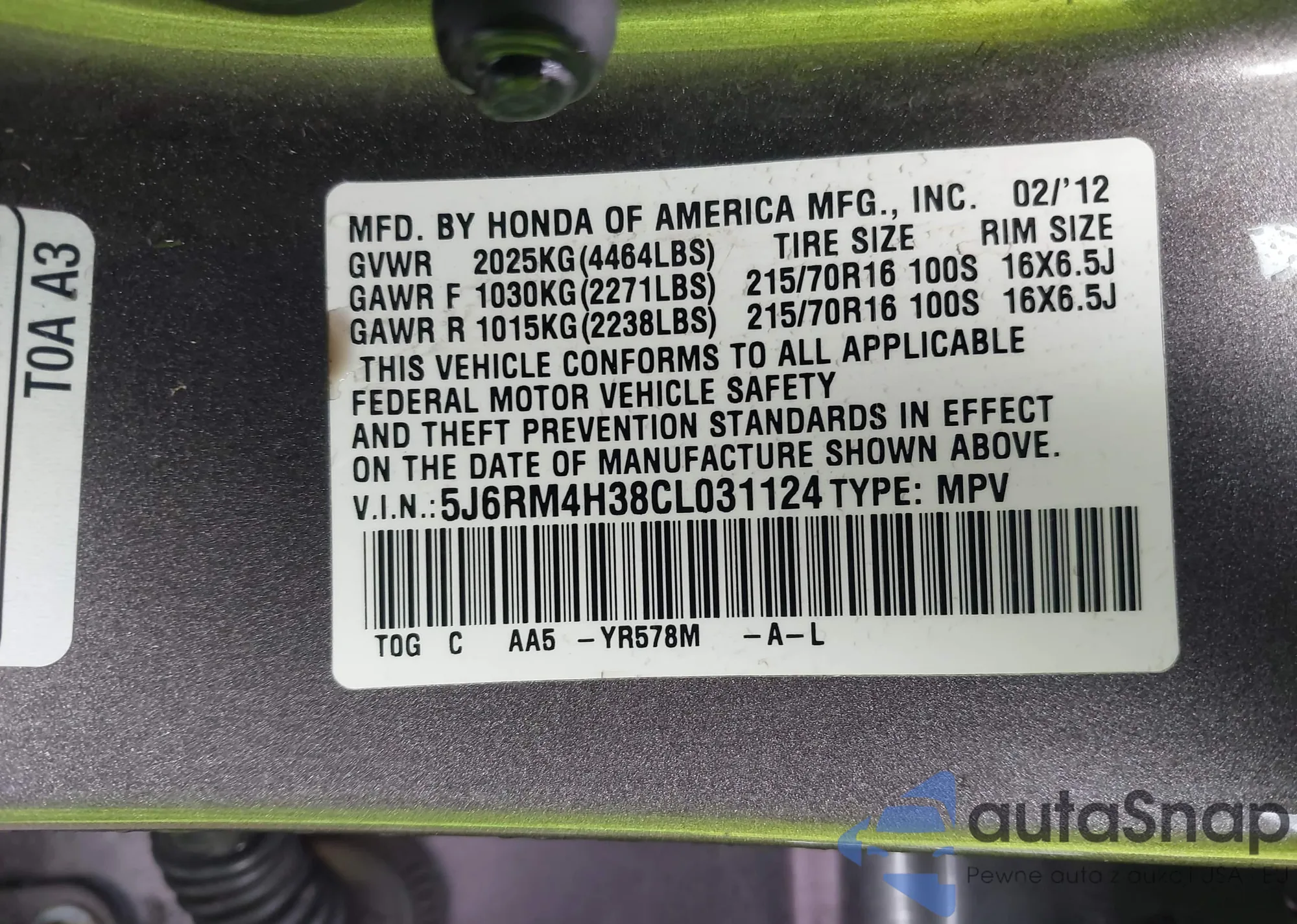 • VIN 5J6RM4H38CL031124