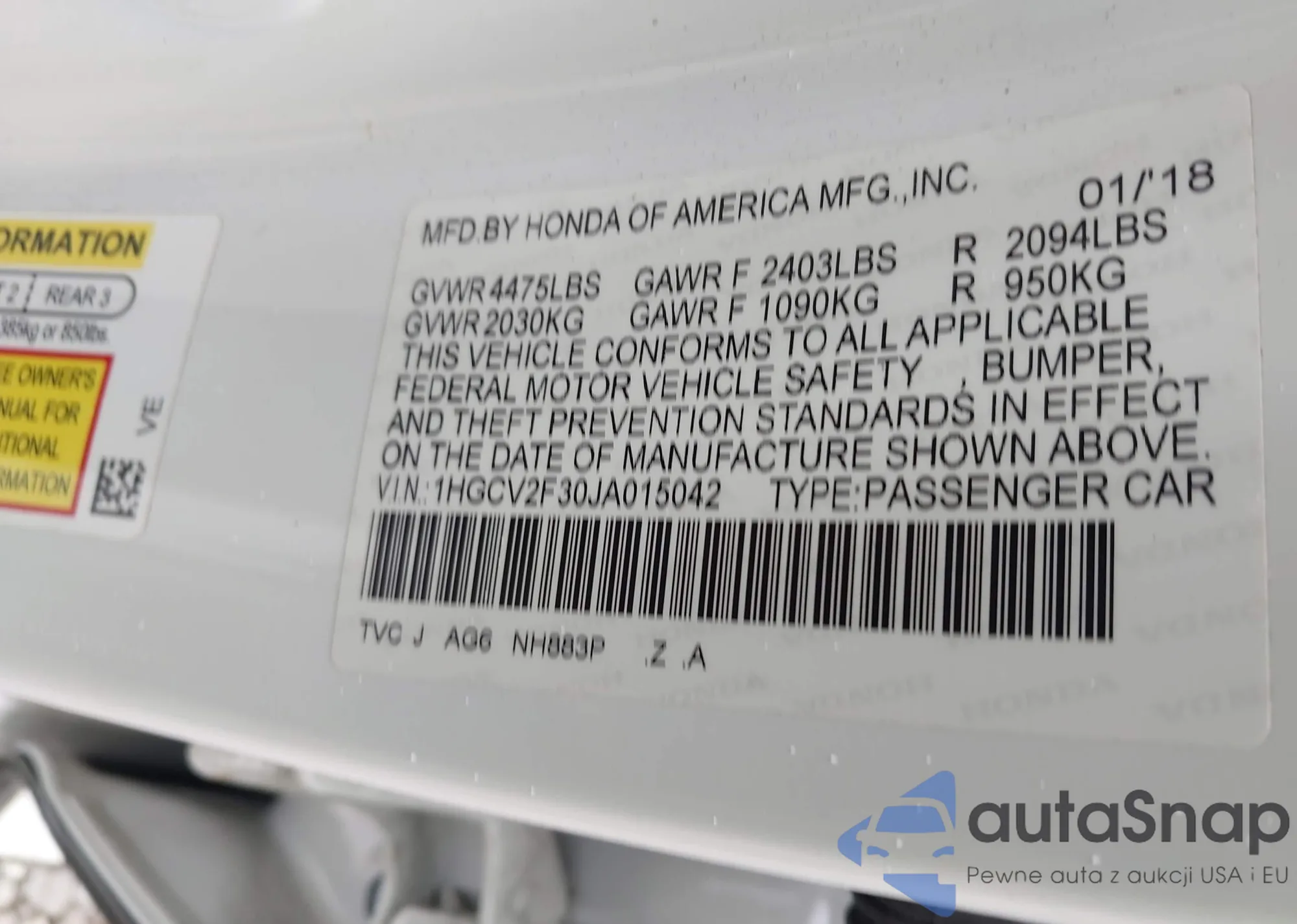 LOT: 43172423 VIN: 1HGCV2F30JA015042
