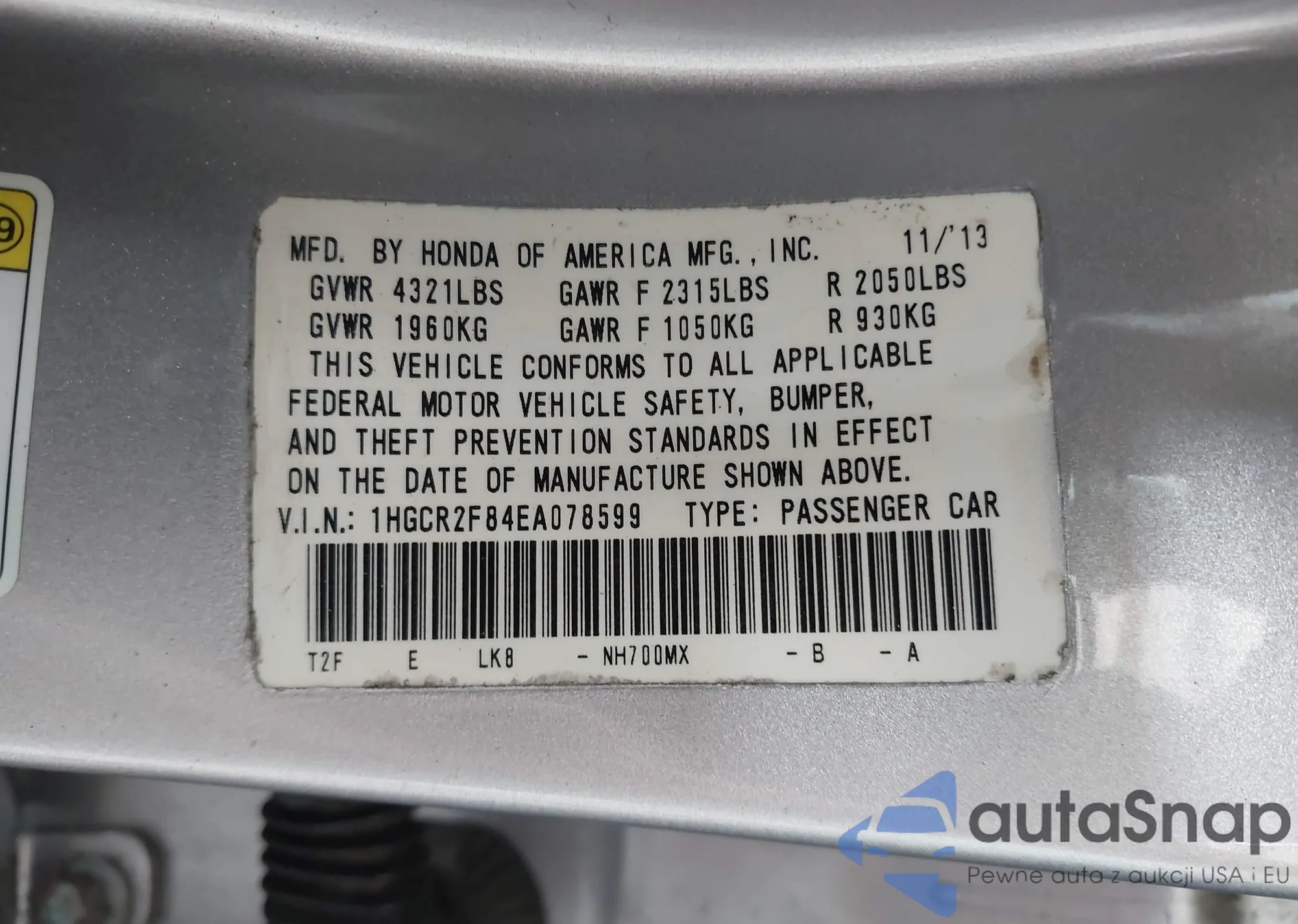 • VIN 1HGCR2F84EA078599