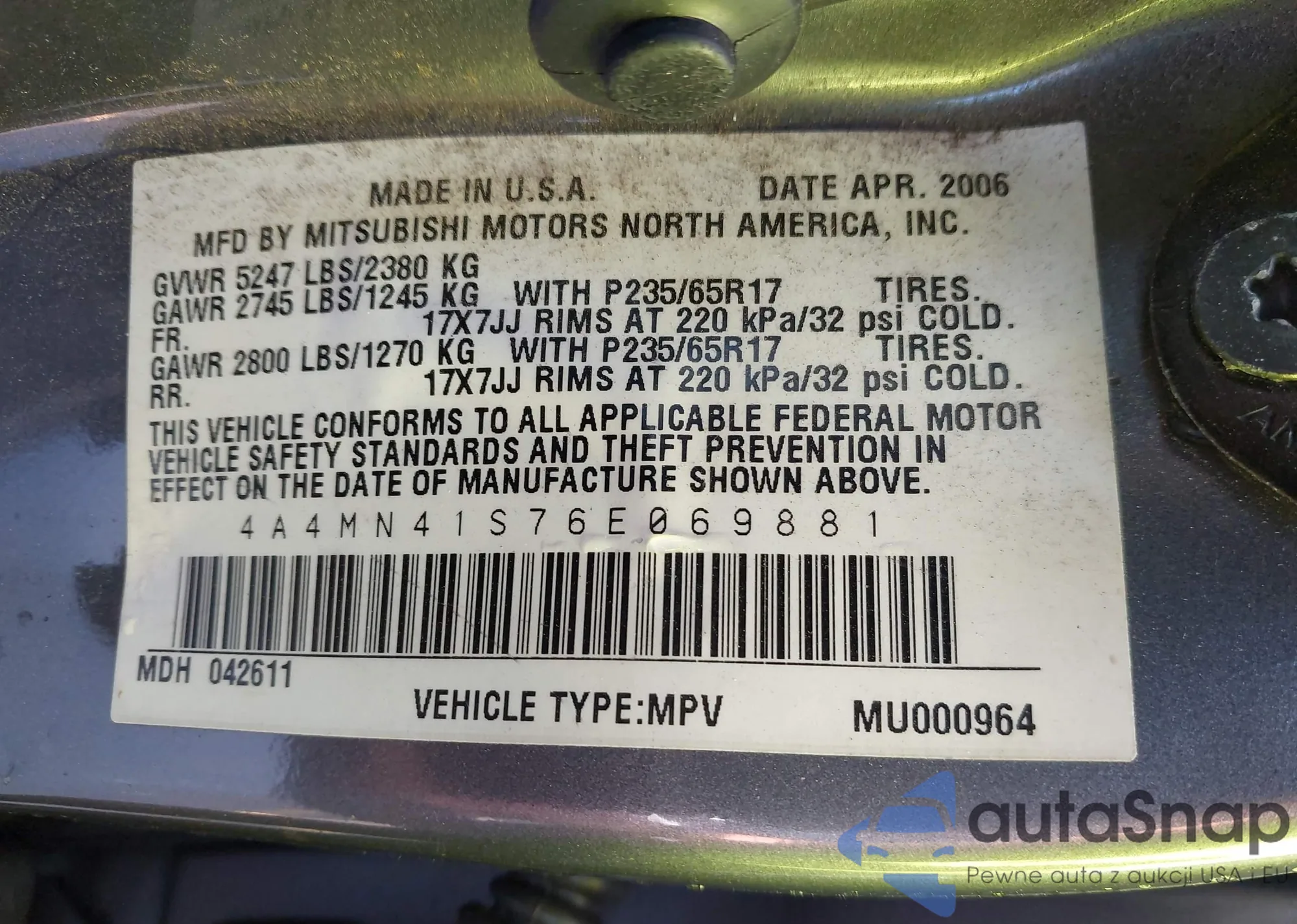 LOT: 43163211 VIN: 4A4MN41S76E069881