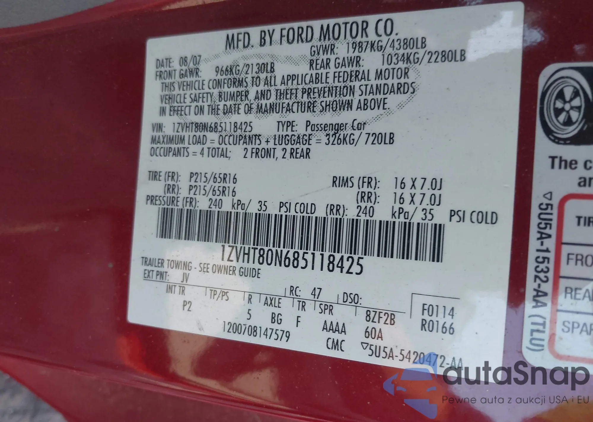 • VIN 1ZVHT80N685118425