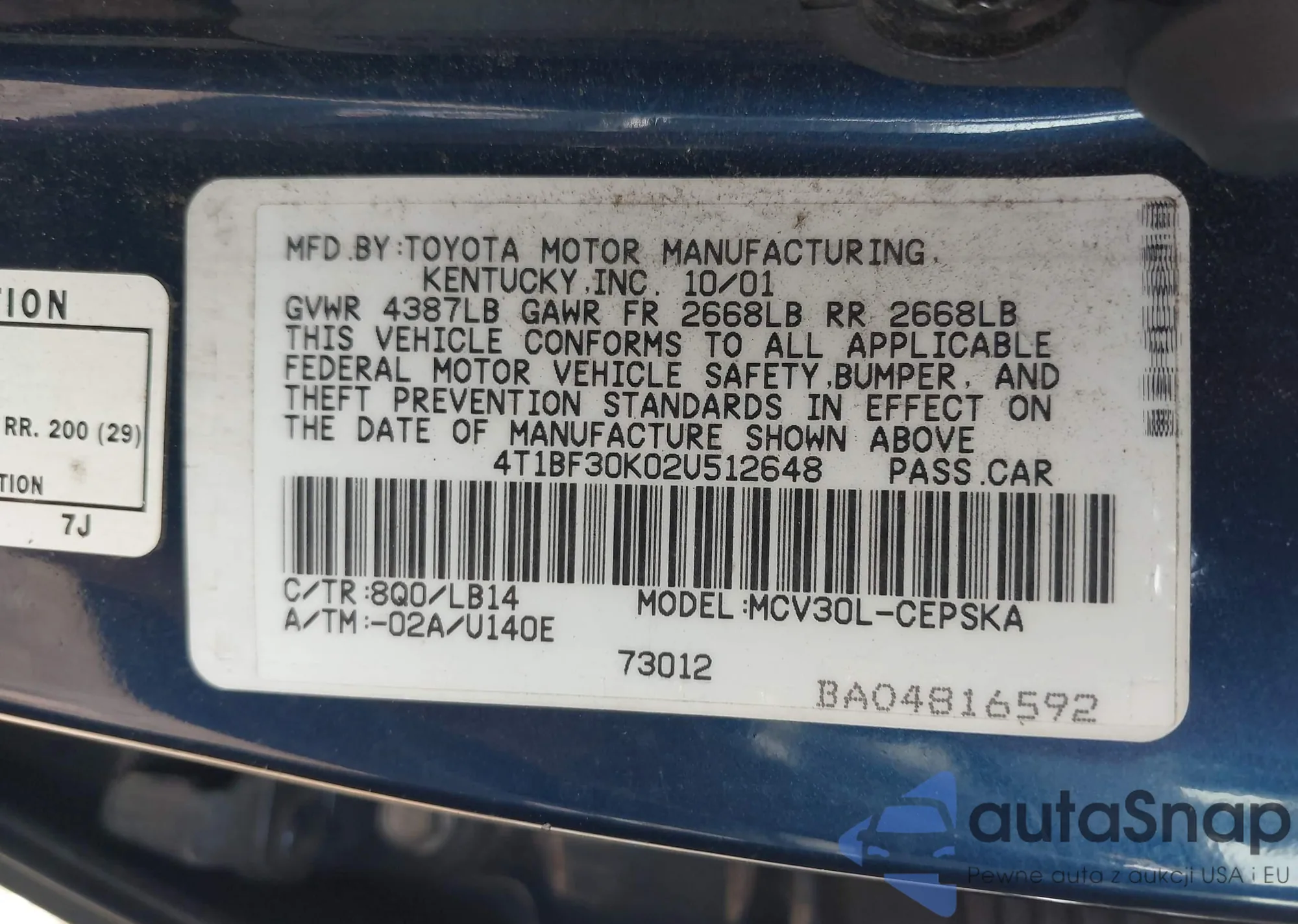 LOT: 43218149 VIN: 4T1BF30K02U512648