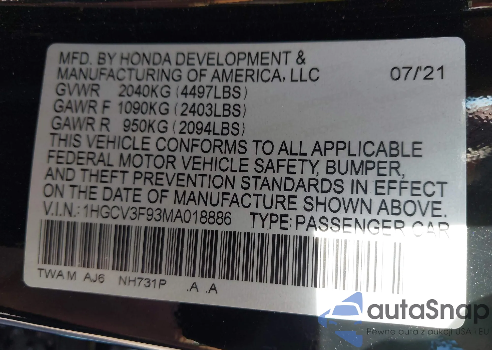 LOT: 43311436 VIN: 1HGCV3F93MA018886