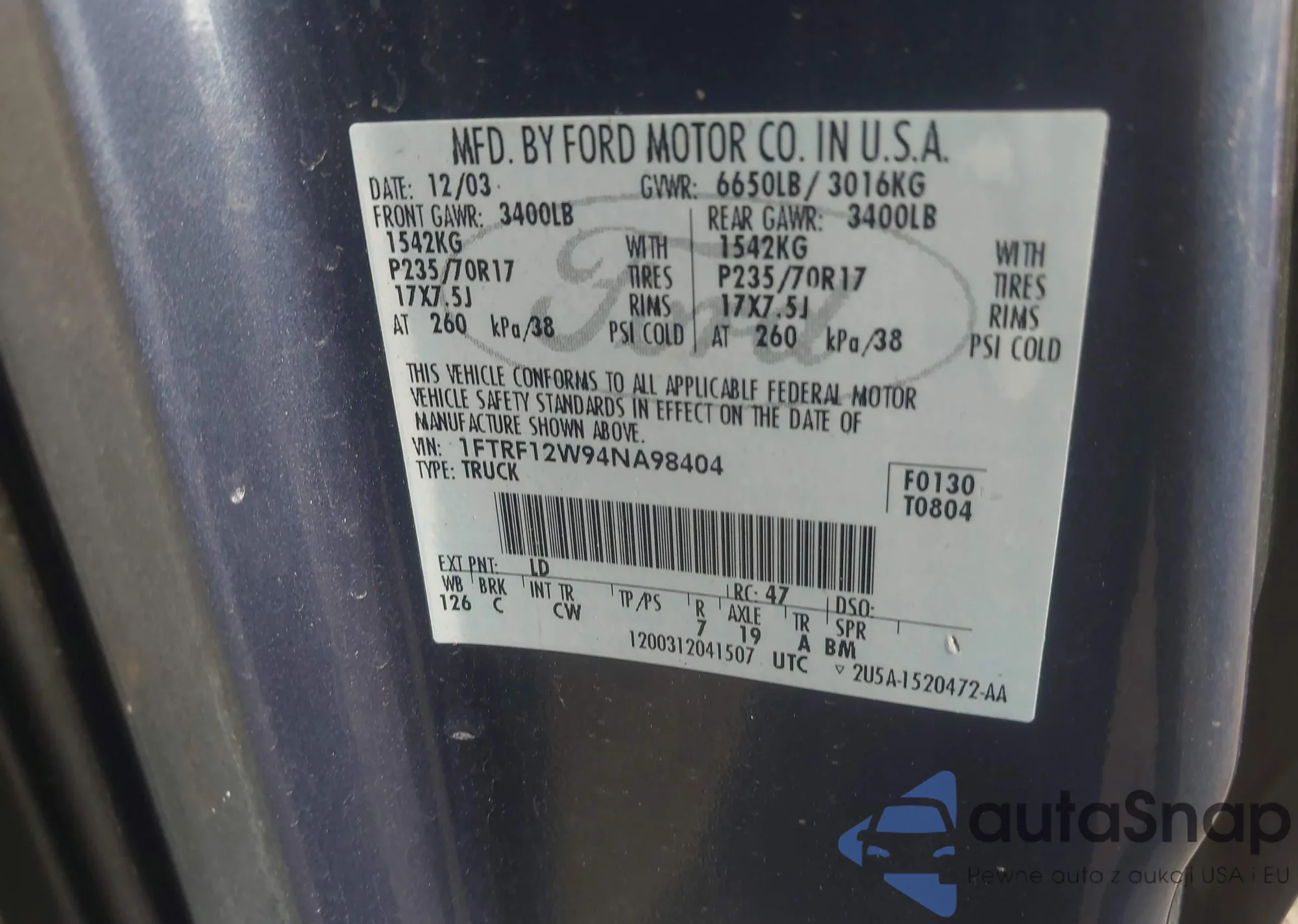 LOT: 43196121 VIN: 1FTRF12W94NA98404