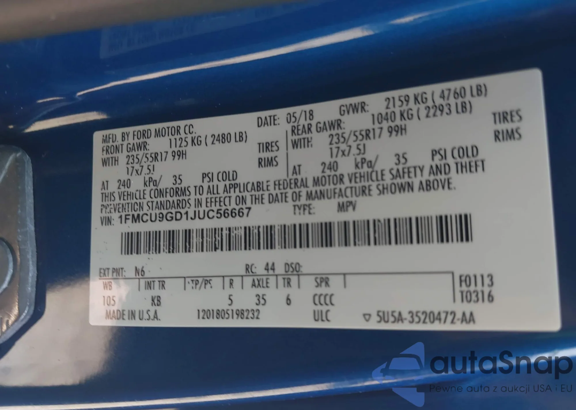 LOT: 43167797 VIN: 1FMCU9GD1JUC56667