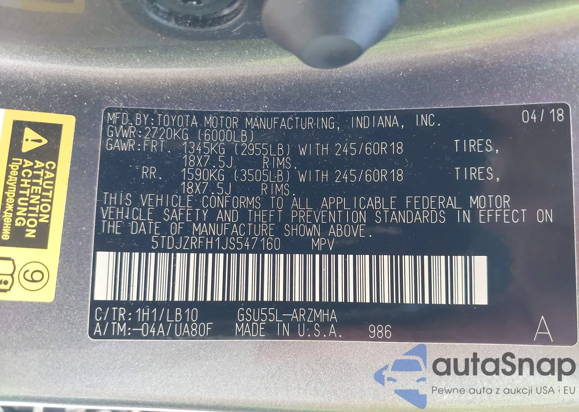 LOT: 43158033 VIN: 5TDJZRFH1JS547160